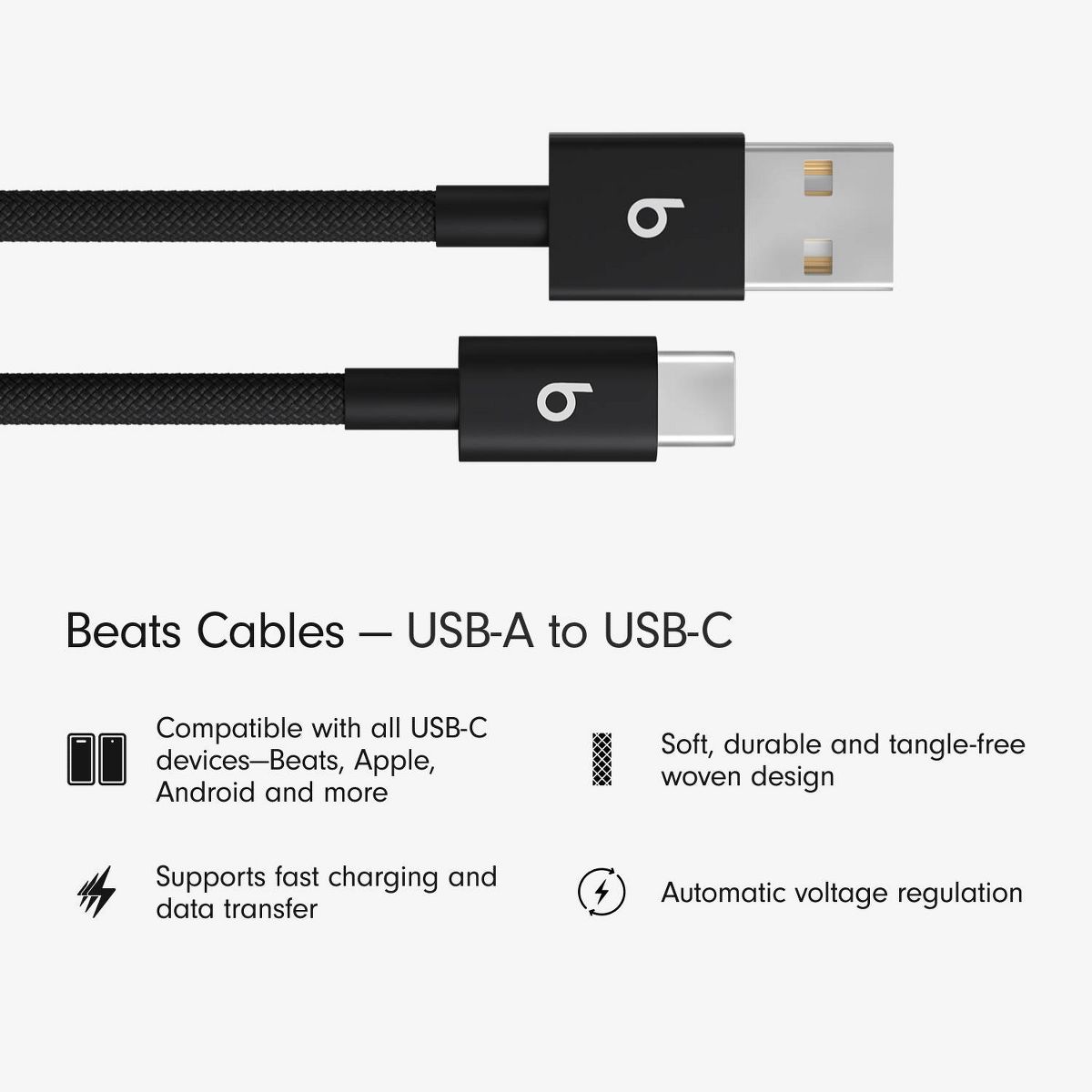 This package includes two 1.5-meter (5-foot*) Beats USB-A to USB-C woven charging cables.