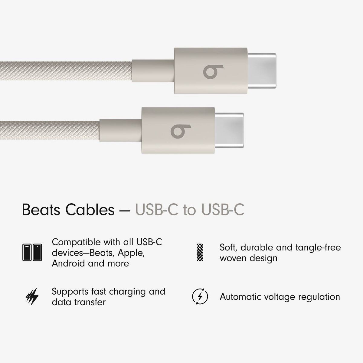 The Beats 1.5-meter (5-foot*) USB-C to USB-C charging cable is made with a tangle-free woven design for extra durability and convenience.
