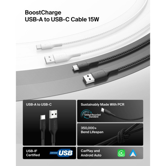 The BOOST↑CHARGE Pro USB-A to USB-C charging cable 15W combines sustainability and performance, powering your iPhone 17 from 0-50% in 45 mins. Durable and sustainable, it withstands 30K+ bends and 10K+ plugs, and is compatible with iPhone 17, iPhone 17 Pro, iPhone 17 Pro Max, iPhone 16, iPhone 16 Pro, iPhone 16 Pro Max, Galaxy S25, S24, Galaxy Note, Pixel 10, 9 & 8, iPad Pro, Nintendo Switch 2 and more.