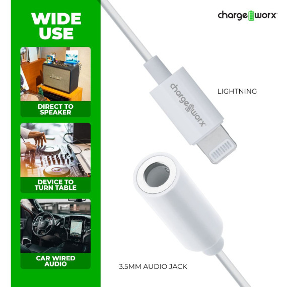 Introducing our Plug-and-Play Lightning Adapter, the ultimate solution for all your audio needs. The Chargeworx Lightning Headphone Adapter creates a 3.5mm auxiliary input on your lightning-equipped devices, allowing you to enjoy your music without any compromise in sound quality or latency. Have a favorite pair of non-Bluetooth headphones you can't use on your latest iPhone? We have you covered. The Chargeworx Lightning Adapter is compatible with iPhone 7 and newer models, and iPad 4th Generation and beyond, ensuring you can keep your favorite headphones timeless and relevant. Our adapter is not only durable but also compact, measuring just 3 inches in length, which means no more tangled cords and easy on-the-go connectivity. Stay connected with Chargeworx. [Compatible with iPhone 14/14 Pro/14 Max/14 Pro Max/ iPhone 13/13 Pro/13 Pro Max/13 Mini/ iPhone 12/12 Pro/12 Pro Max/12 Mini/ iPhone 11/11 Pro/11Pro Max/ iPhone XS/XS Max/11 Pro Max/ iPhone XR/X iPhone 8 and 8 Plus/ iPhone 7 and 7 Plus. iPads 4th Generation and later.]