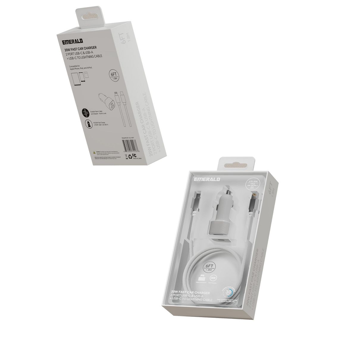 Emerald 2 Port Car Adapter + 6FT Lightning Cable - Black Charger for iPhone