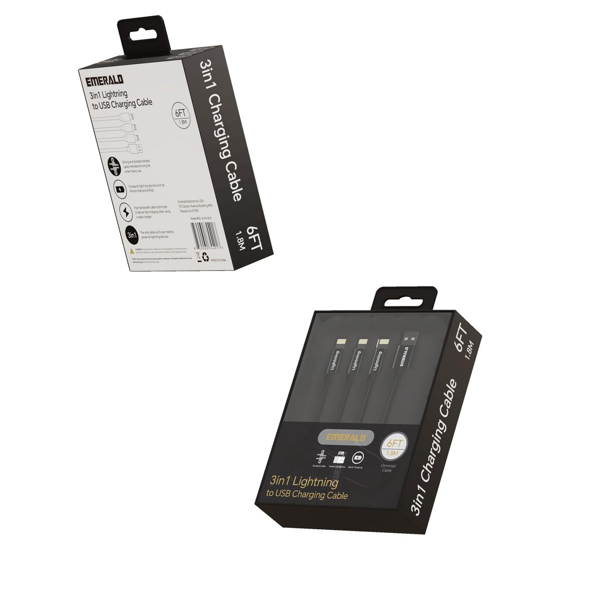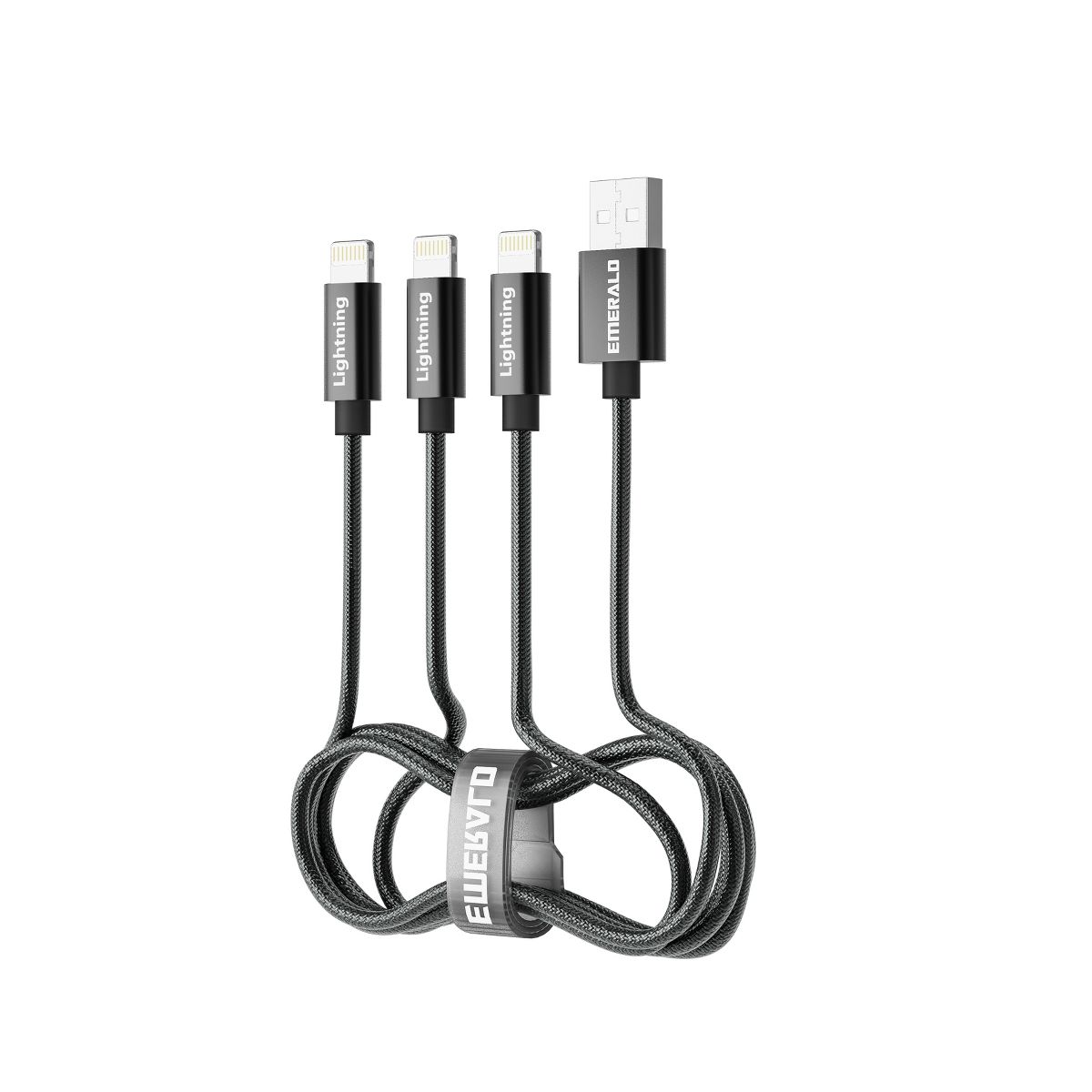 Emerald 6ft 3-in-1 Braided USB-A to Triple Lightning, Charging & Data Syncing Cable - Black