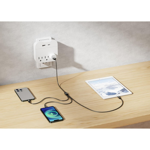The length of the cord and ability to charge 3 devices at the same time makes this a great purchase. I wish the separation of the 3 cords made them a little longer individually, but the overall length of the cord is impressive. This charged my Apple device quickly and efficiently. It will be helpful for traveling and having less access to electrical outlets. I recommend this product! I received an incentive to write this review.