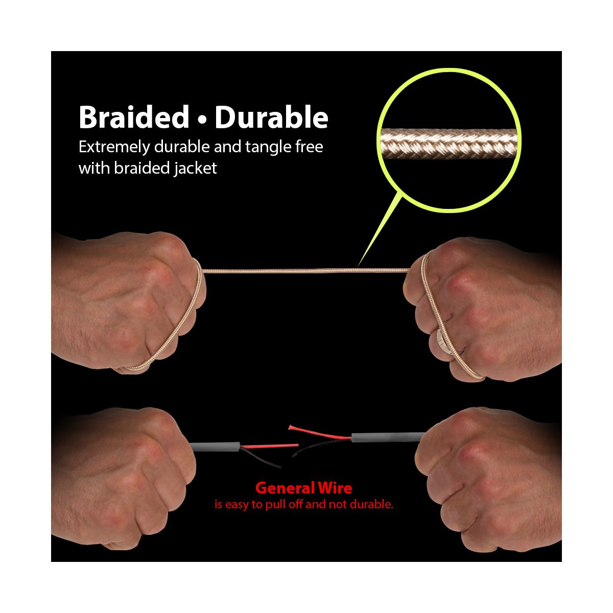 The Fabric Braided Jacket provides extra cable durability and protects it from damage. Tangle-free and tear resistant helps it perform in top shape.