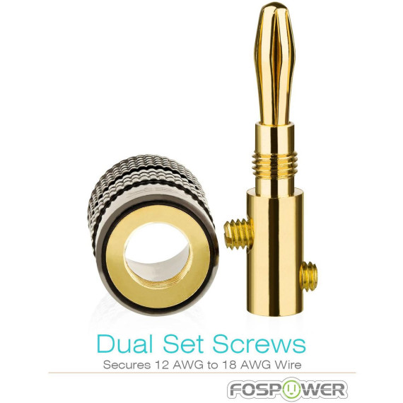 FosPower's banana plugs make speaker installation simple. They are designed for use with speakers, A/V receivers, amplifiers, surround sound systems and banana wall plates that use banana style binding posts. Banana plugs make it easy to connect speaker wire to your amplifiers/receivers and speakers.