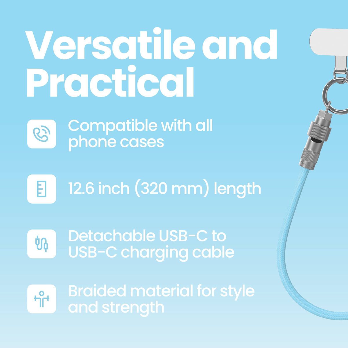 The GEMS Universal Phone Wristlet USB-C Cable keeps your phone close and ready to charge in one clever design. This 2-in-1 accessory works as a secure wristlet and a detachable USB-C to USB-C charging cable, so you always have power within reach. The universal connector card slips easily into any phone case, while the 12-inch braided nylon cable adds both durability and a modern look. Whether you’re traveling, commuting, or running errands, the GEMS Universal Phone Wristlet USB-C Cable helps you stay organized and connected wherever you go.