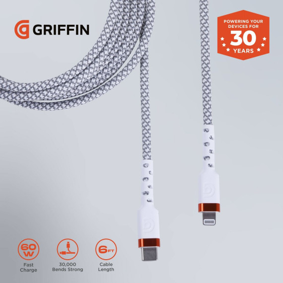 GRIFFIN Lightning to USB-C Cable, Braided Fast Charging with Reinforced Aluminum Connectors, Designed for Long-Term Performance and Reliability
