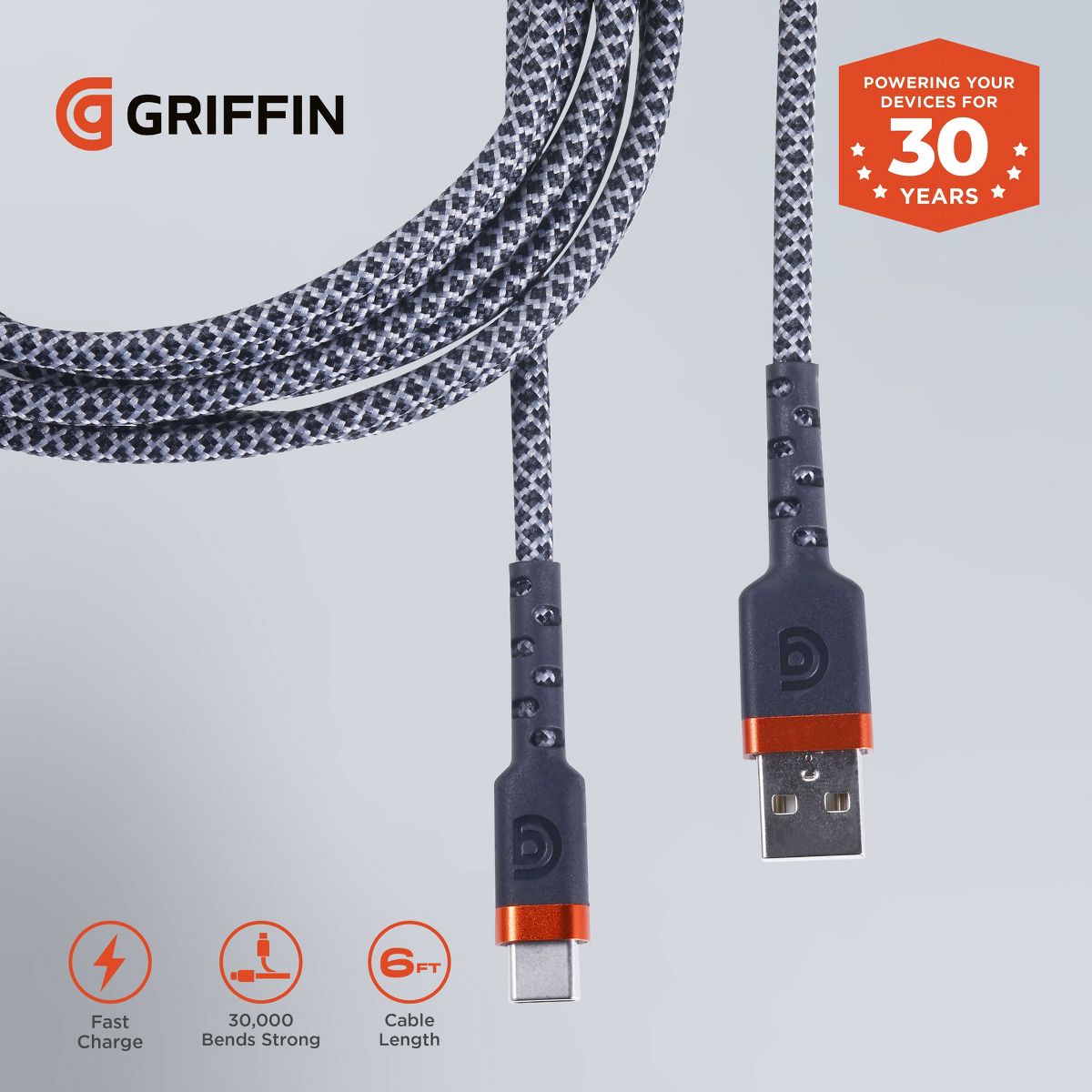 GRIFFIN USB-C to USB-A Fast Charging Cable, Heavy-Duty, Long-Lasting Braided Cord - 30,000 Bend Rating for Phones, Tablets, and More