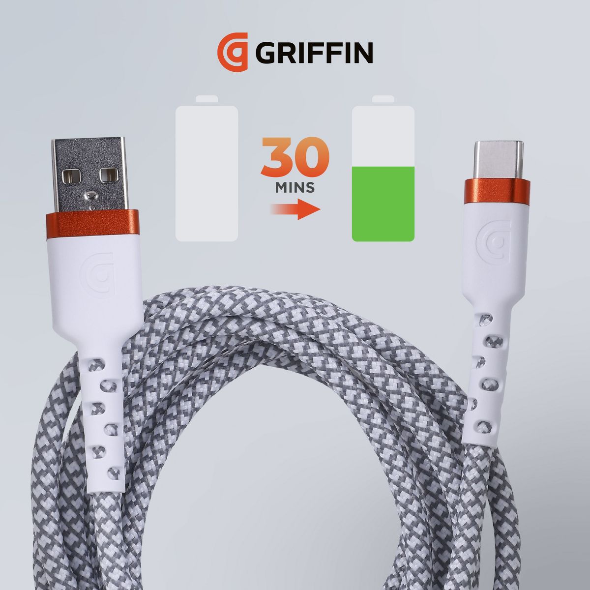 GRIFFIN USB-C to USB-A Fast Charging Cable, Heavy-Duty, Long-Lasting Braided Cord - 30,000 Bend Rating for Phones, Tablets, and More