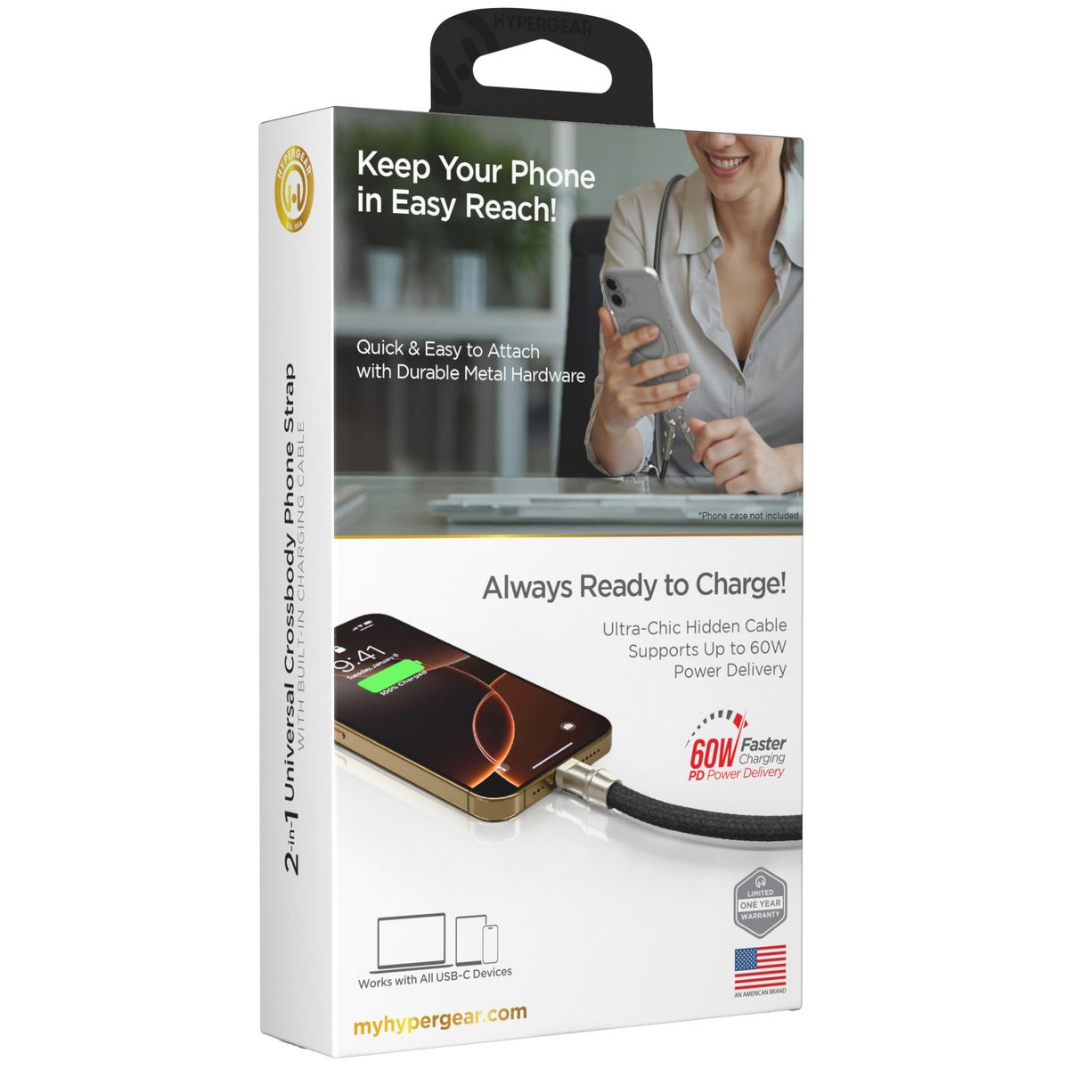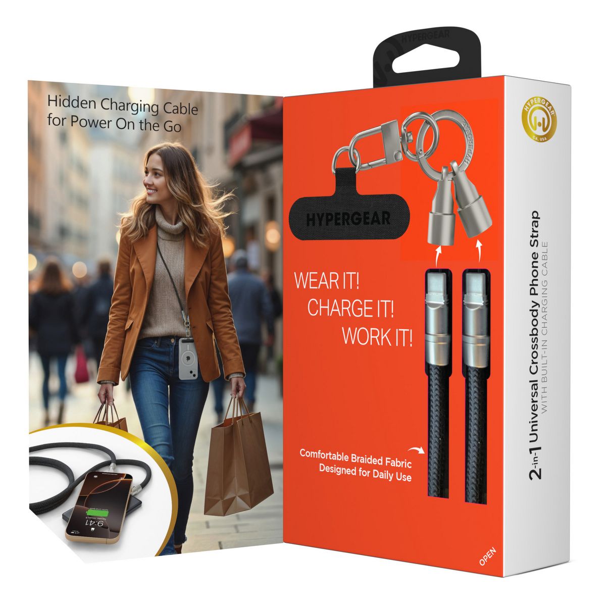 No pockets? No purse? No worries! Wear your phone hands-free and stress-free with the HyperGear® Universal Crossbody Phone Strap. With its combination of comfortably soft braided rope and durable matte metal hardware, it’s as chic and stylish as it is practical. Install it to your phone case in seconds, and the secure, undroppable design keeps your phone safe, accessible, and within easy reach, even during your busiest days. A hidden USB-C® cable built into the strap ensures you’re always ready to charge – just twist off the cable tip covers for access to super-fast power wherever you go. Compatible with all USB-C® devices: iPhone® 15 or later, Samsung Galaxy®, Google Pixel™, and more.
