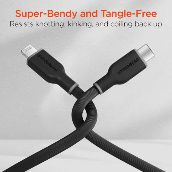 It’s time for a charging upgrade. Super-soft and super-bendy, the HyperGear® Flexi Pro USB-C® to Lightning® Fast Charge and Sync Cable flows where you take it and stays where you want it – no more twists, kinks, and tangles. The super-durable and tear-resistant exterior is 10x stronger than standard cables while being oh-so-soft to the touch, and it comes with a silicone cable strap for on-the-go convenience. MFi certified for safe and seamless use with all Apple® Lightning® devices, and Power Delivery-enabled so you can super-fast charge your iPhone® from 0 to 50% in around 25 minutes.