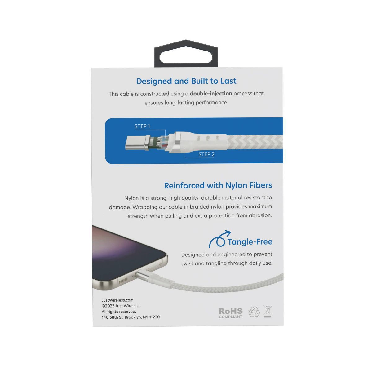 The Just Wireless Ultra 6' USB-C to USB-C nylon braided charging cable is the ultimate companion for your tech-fueled life. This cable is engineered with a double injection process, nylon braiding, and ultra-strength connector joints, ensuring unmatched durability and performance. It provides a reliable charging solution for a wide range of USB-C devices, including smartphones, tablets, laptops, gaming consoles, cameras, power banks, headphones, and other devices.