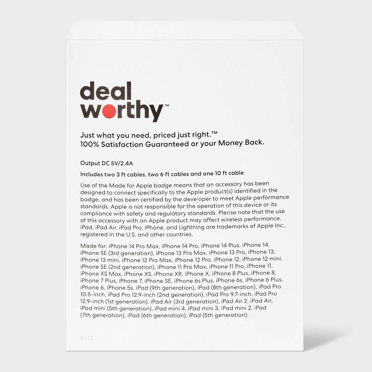 5 pack of USB-A to Lightning Cables by Dealworthy is really nice this set of cables includes the following sizes, 2 3'’s,2 6'’s, and 1 10' sized cables. With so many size varieties it helps me have the right sized charging cable for each occasion. These cords are effective and fast to charge my phone. I would highly recommend!