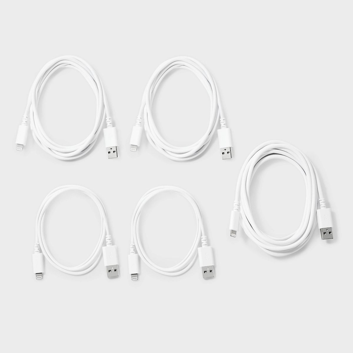 Stay powered up with the Lightning to USB-A Charging Cables (3'/3'/6'/6'/10') 5pk from dealworthy™ in White. The pack includes two 3-foot cords for on-the-go charging, two 6-foot cords for everyday use, and one 10-foot cords for extended reach. Whether you're at home, work or traveling, these durable cords ensure fast and reliable charging for your Apple devices.