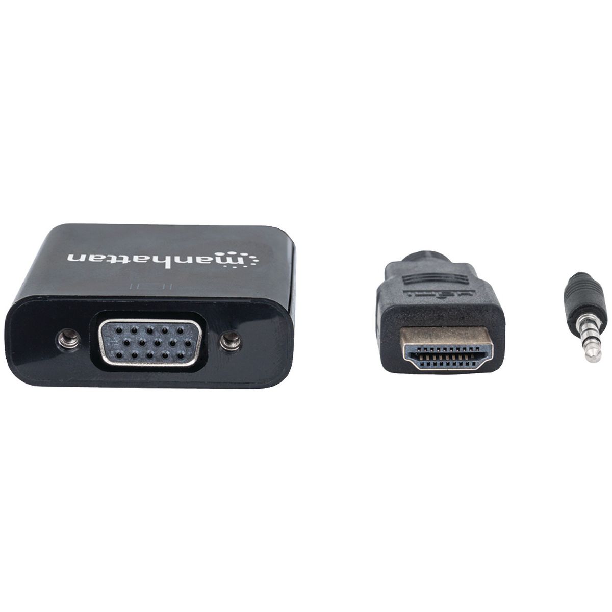 Here's a simple solution to connecting media and display devices! The Manhattan 151559 HDMI to VGA Converter helps establish a fast, simple and convenient link between newer HDMI equipped desktop and laptop computers and other media sources with existing VGA monitors, projectors and other display devices. The Manhattan HDMI to VGA Converter is easy and quick to install and requires no complicated configuration or setup to help extend the service life and fully realize the investment and value of legacy VGA displays, projectors and other equipment. This low-power, cost-effective and reliable solution allows users to transition to HDMI bandwidths, resolutions, Deep Color and more without the expense of upgrading to newer and costly monitors and projectors. Its all-in-one design helps achieve a compact, integrated solution that eliminates unnecessary cables, tangles and clutter to keep installations and work spaces neat and orderly. Its 3.5 mm stereo port allows the converter to transmit audio to an external audio device with convenient, included 3.5 mm audio cable, and its micro USB port allows for additional power if required._