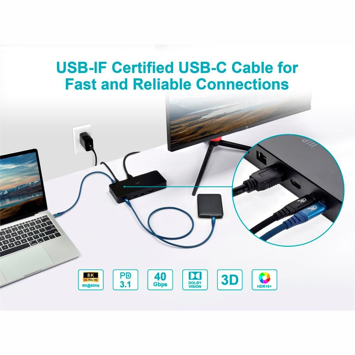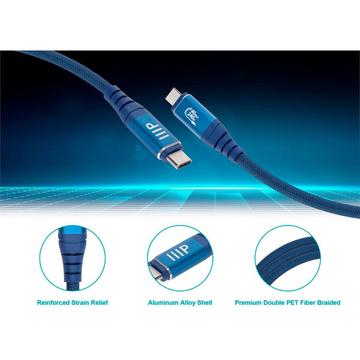 Monoprice USB4 40Gbps Cable 240W EPR, 8K HDR, USB-IF Certified, Braided, Ultra High-Speed, 3ft, Navy ensures fast and reliable data transfer and charging. Built for durability and compatibility with a wide range of devices.