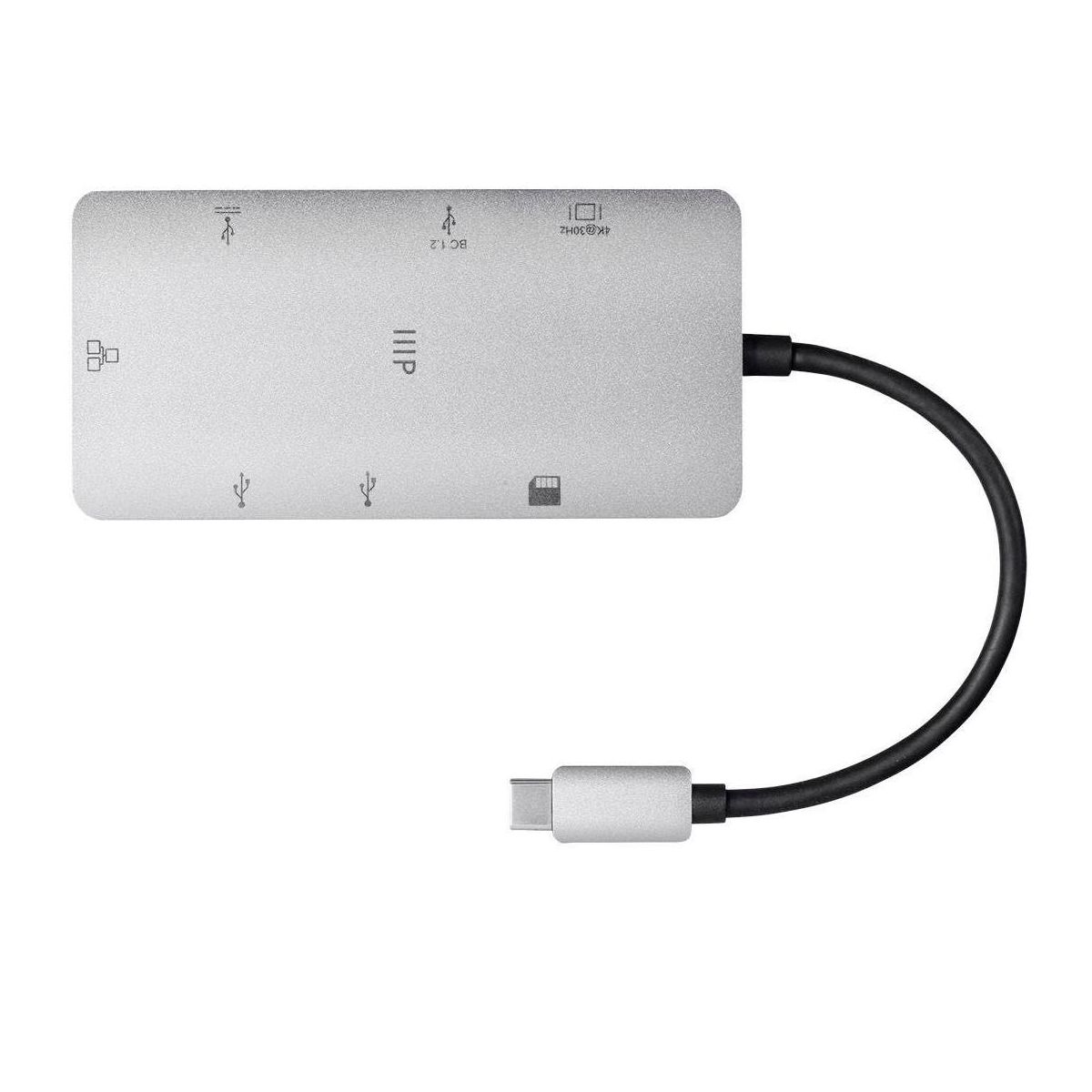 Extend your reach and grasp new possibilities your USB Type-C computer with the Monoprice Consul Series of USB-C adapters! By unlocking USB-C 3.1 functionality, the consul series is able to offer a variety options to expand your ability to work anywhere you need or want. This consul series USB-C to HDMI adapter allows you to connect an external HDMI display to mirror your laptop's display or expand your system's desktop area, with support for resolutions up to 4K@30Hz. It also features a Gigabit ethernet port, a USB-C port, USB 3.0 Type-A charge and sync port, two USB 3.0 Type-A data ports, and SD and microSD UHS-I card slots for advanced data transfer capabilities for your computer's USB-C port. The built-in Gigabit ethernet adapter allows you to enjoy the superior security and increased speeds of a wired ethernet connection. USB 3.0 connectivity allows you to charge and sync mobile devices or use external drives and provides data transfer speeds up to 5Gbps through either the USB-A or USB-C ports. The USB-C port supports the Power Delivery (PD) 3.0 standard, delivering up to 100 watts of power to compatible devices. The PD 3.0 standard also ensures that connected devices won't reset or disconnect when power is applied to or removed from the USB-C port. The lightweight and premium aluminum design results in a better built adapter, making it more durable than adapters made of plastic.