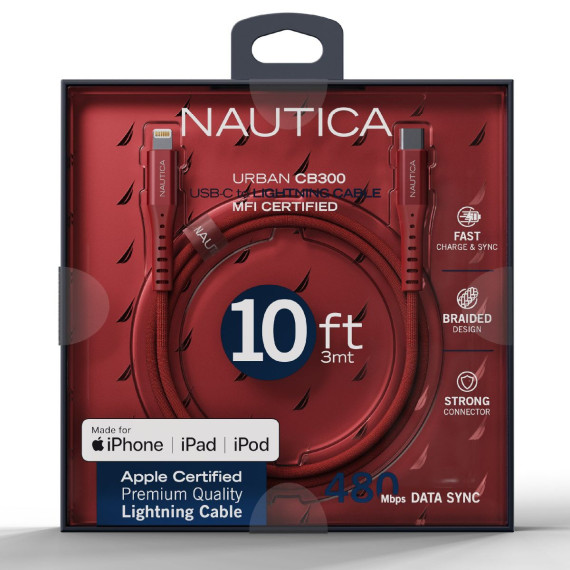 The Nautica CB300 USB-C to Lightning cable is crafted to deliver seamless Apple device charging and syncing. MFi certified for flawless compatibility, it ensures secure, fast, and reliable performance. Designed with a premium braided fabric cover, it offers durability while resisting tangling and fraying. Reinforced metal connectors and real copper wiring provide efficiency, safety, and long-lasting use. Available in 4, 6, and 10-foot lengths, the CB300 adapts to your lifestyle—whether at home, work, or on the go.