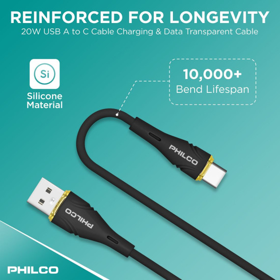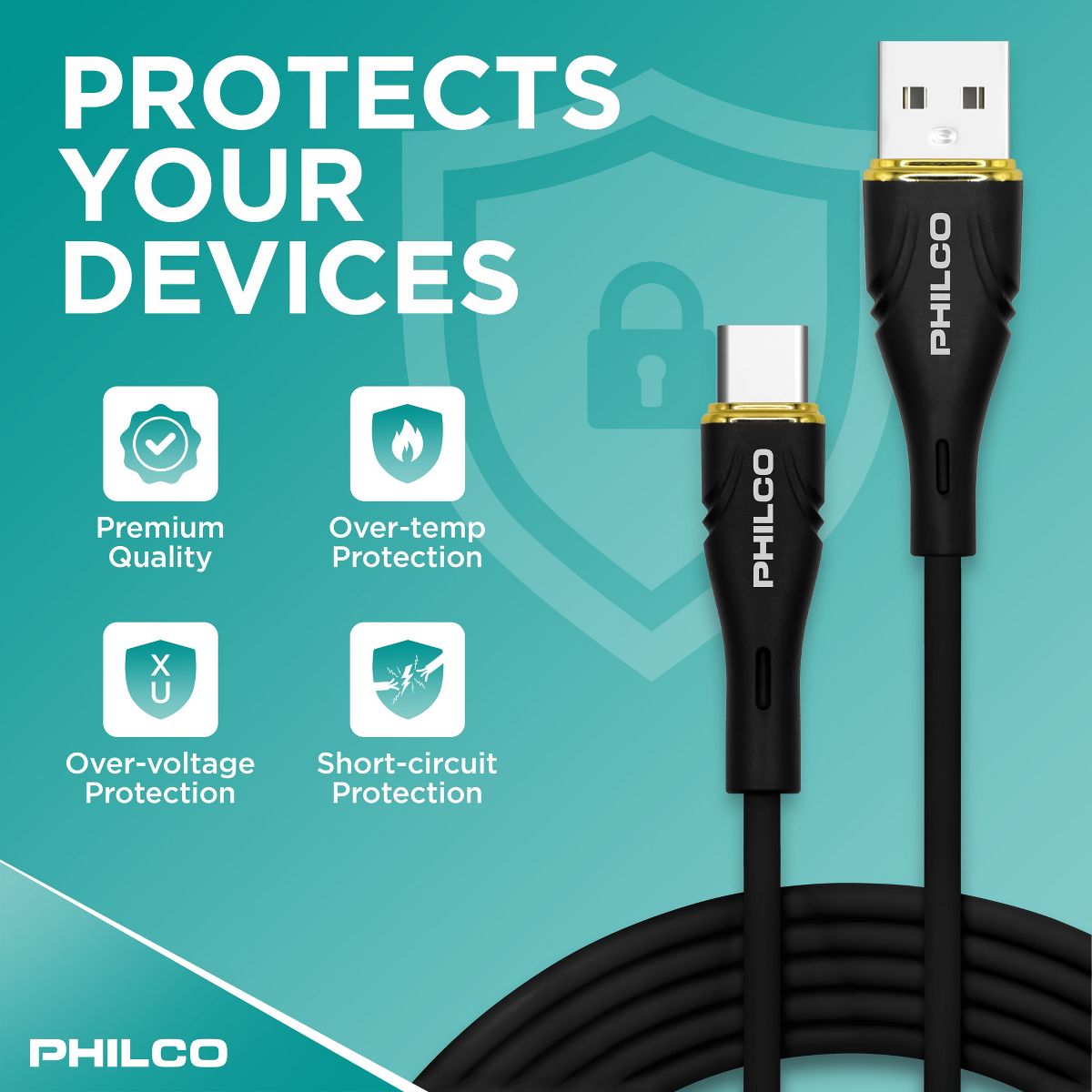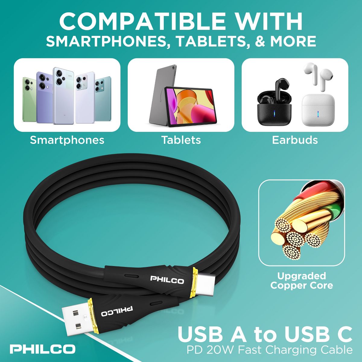 PHILCO USB A To Type C Cable, Silicone, 4Ft Length, 20W Fast Charging, High-Speed Data Transfer, Compatible with USB-C Devices, Tangle-Free, Black