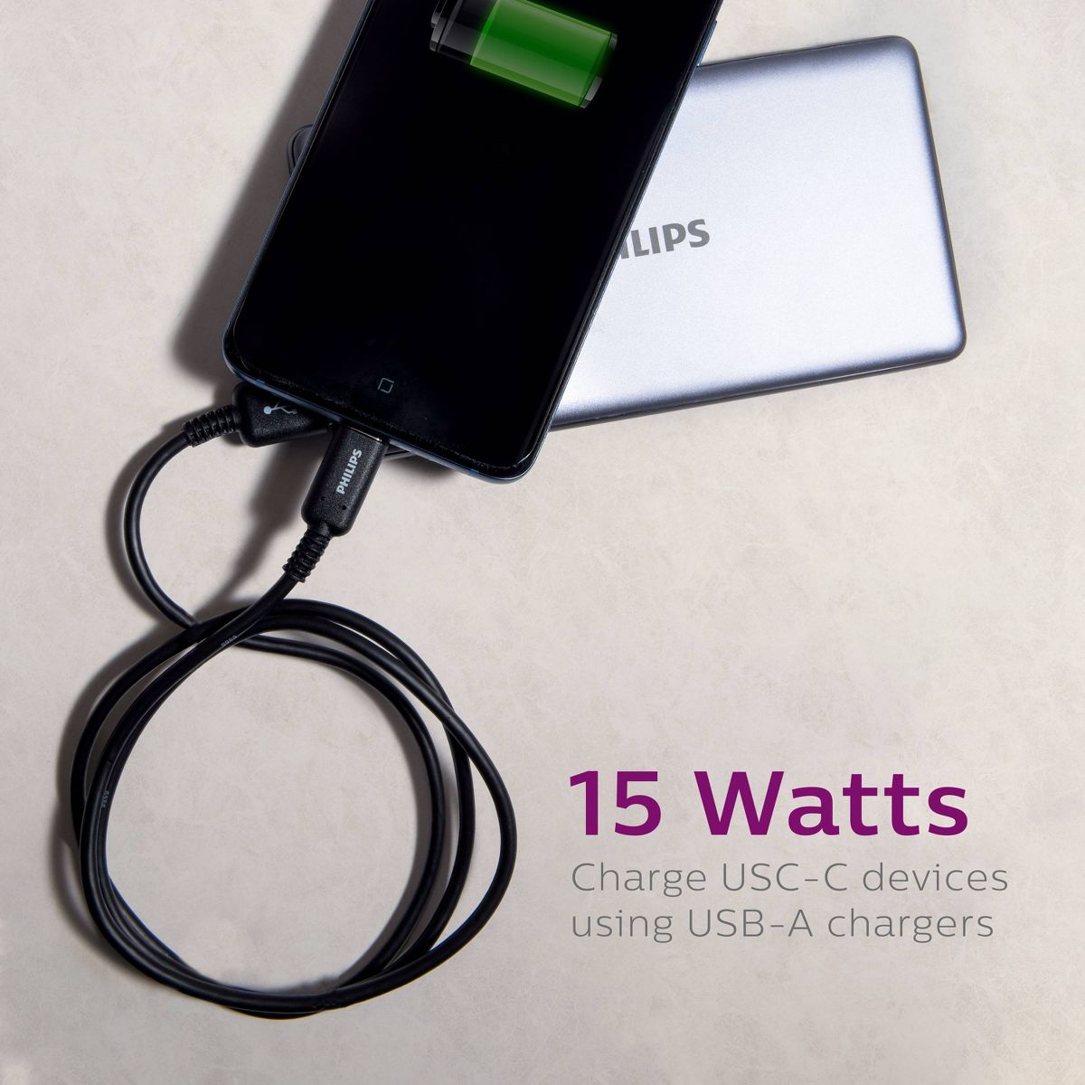 The USB-C connector is reversible, with no up or down orientation, attaching easily on the first try. Additionally, the cable can send or receive data at a rate of 480 megabits per second while providing up to 15 Watts of charging power. The charging cable is 6ft. long, offering versatile setup options for your home or office space. The elegant black cable provides the power and accessibility needed to continue enjoying the electronics that simplify, organize and improve your life. Make the connection between your electronics with a Philips USB-C to USB-A 6ft. Charging Cable. Model #DLC4106A/37
