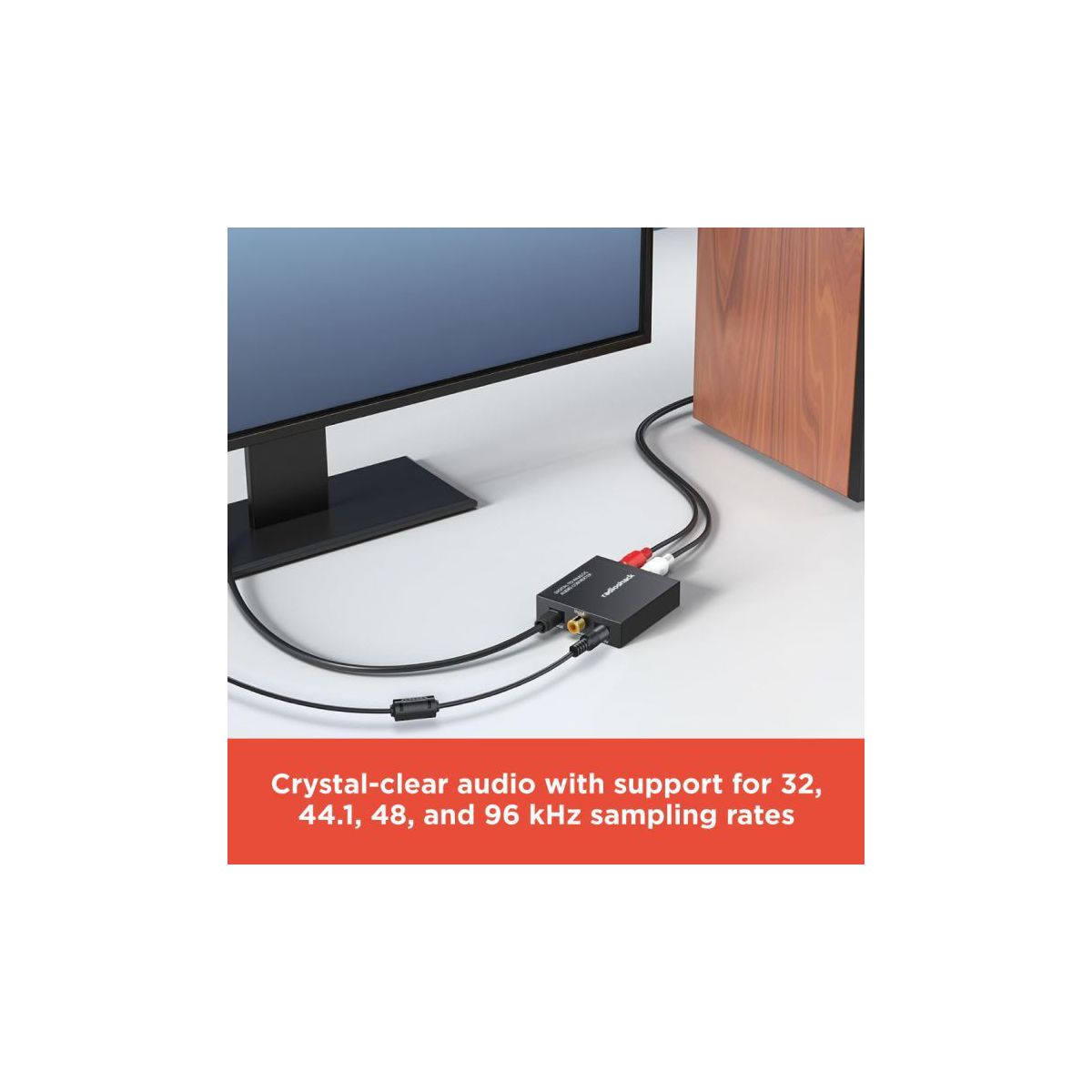 Experience crystal-clear audio reproduction with minimal signal interference, thanks to the optic technology in this digital-to-analog converter, ensuring every note, every beat resonates with the lifelike fidelity you are used to hearing. Whether you're indulging in your favorite music, or listening to an audiobook with friends, this cable delivers an immersive sonic experience that transcends expectations. Its durable construction and strain-relief connectors and box ensure long-lasting performance, while its plug-and-play design allows for easy installation and hassle-free setup. Don’t throw away that old technology. Instead, reintegrate it back into use with this optical to dual RCA audio digital-to-analog converter cable, where precision meets performance and excellence meets enjoyment.