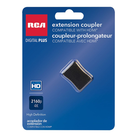 Do you need a longer HDMI® cable? Use this RCA Inline Extension Coupler to connect 2 shorter, passive HDMI® cables to create a longer cable run. This coupler carries high-definition 2160p video and digital audio signals and supports 3D, Ethernet, and audio return channel. It works with devices such as Blu-ray™, HD satellite, HD cable, DVD, HDTV, and A/V receivers. Please note: if you have older standard HDMI® cables, a passive run can be up to 49 ft. A cable run of Premium High Speed passive cables (HDMI® 2.0) should not exceed 25 ft.