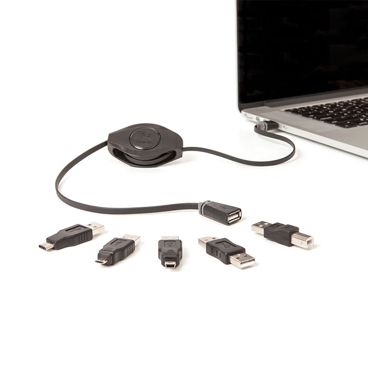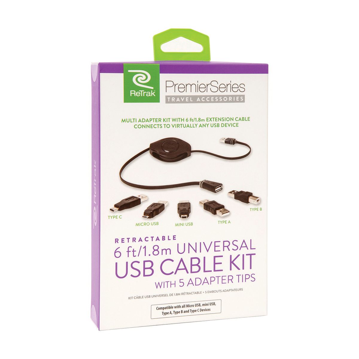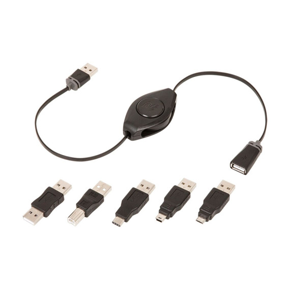 The ReTrak Universal USB Extension Retractable Cord is the end-all be-all solution for connecting almost any external USB device. This universal USB extension cable comes with 5 adapter tips so that you can easily connect to various devices with just one cable! Its compatible with any USB device as well as USB-B, Micro 5, Mini 5, USB Male to Male, and USB-C devices. This universal USB extension cable will cover many connection combinations, saving you a ton of space from cable clutter. This universal USB extension cable has reinforced connectors that prevent fraying from every day use. With a tangle-free and retractable cable, you can extend the cord to a customizable length that fits your needs.