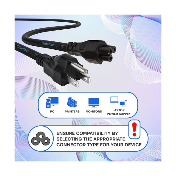 SatelliteSale Universal Heavy Duty Computer Power Cable Male NEMA 5-15P to Female IEC C5 Universal Wire ensures a great and reliable power transmission to your gadgets. It is an essential cord to buy when it comes to plugging-in laptop computers with a three-slot power supply adapter. Our e Universal Heavy Duty Computer Power Cable is an easy-to-use, plug-'n'-play accessory. It provides an uninterrupted electric connection to the connected devices. A PVC jacket combines a simple, minimalistic design and safety of the cord, preventing bending damage. C5 connectors fit in the device's inlet perfectly, and won't get loose or fall out. Comes in different lengths of 6 feet and 15 feet. SatelliteSale Universal Heavy Duty Computer Power Cable Male NEMA 5-15P to Female C5 is perfect for users who regularly plug and unplug cables. Our cord provides excellent compatibility with a wide range of devices and works well as a spare cord. Plug-in your modern computers, laptops, most power bricks for laptops/notebooks, monitors, scanners, printers, and other devices with a C5 power inlet. Every cable we sell is a perfect match for both commercial and residential use: you can replace your existing overused, old, broken, damaged, or misplaced power cable and even add some extra length between devices for your convenience. Rated for use with North American power outlets (USA, Canada). Please, check the product pictures to make sure this cable is compatible with your devices. In addition, we assure the lifetime service of each cord to deliver a positive experience to our clients.