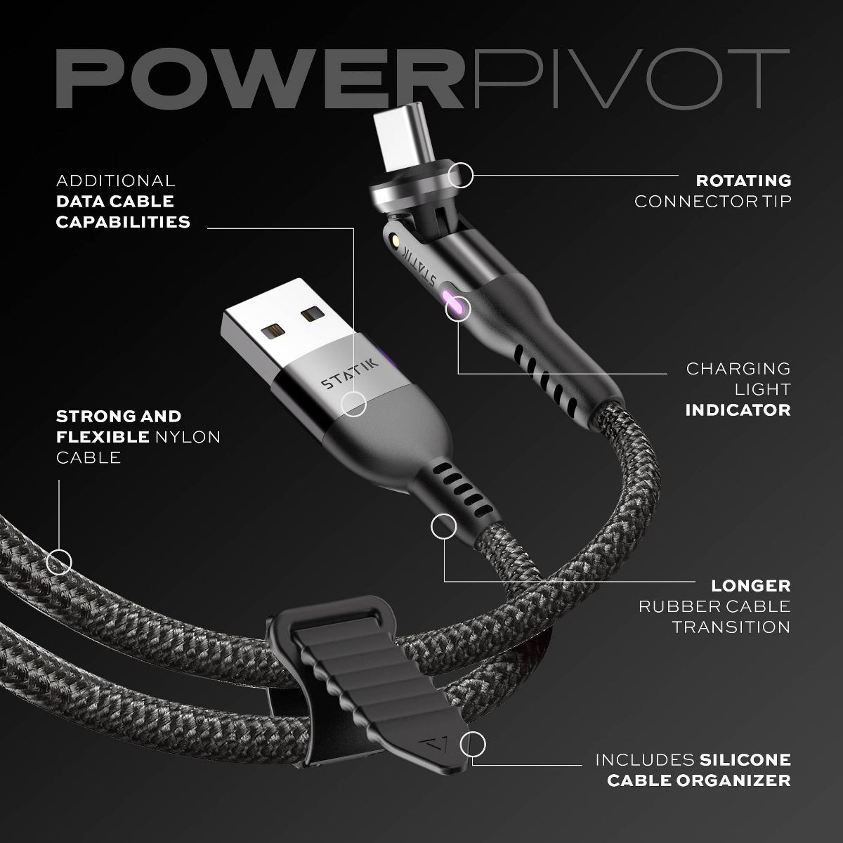 STATIK 3.3' PowerPivot 360-degree Nylon Braided USB-A to USB-C Charging Cable - Black: 480 Mbps Data Transfer Rate