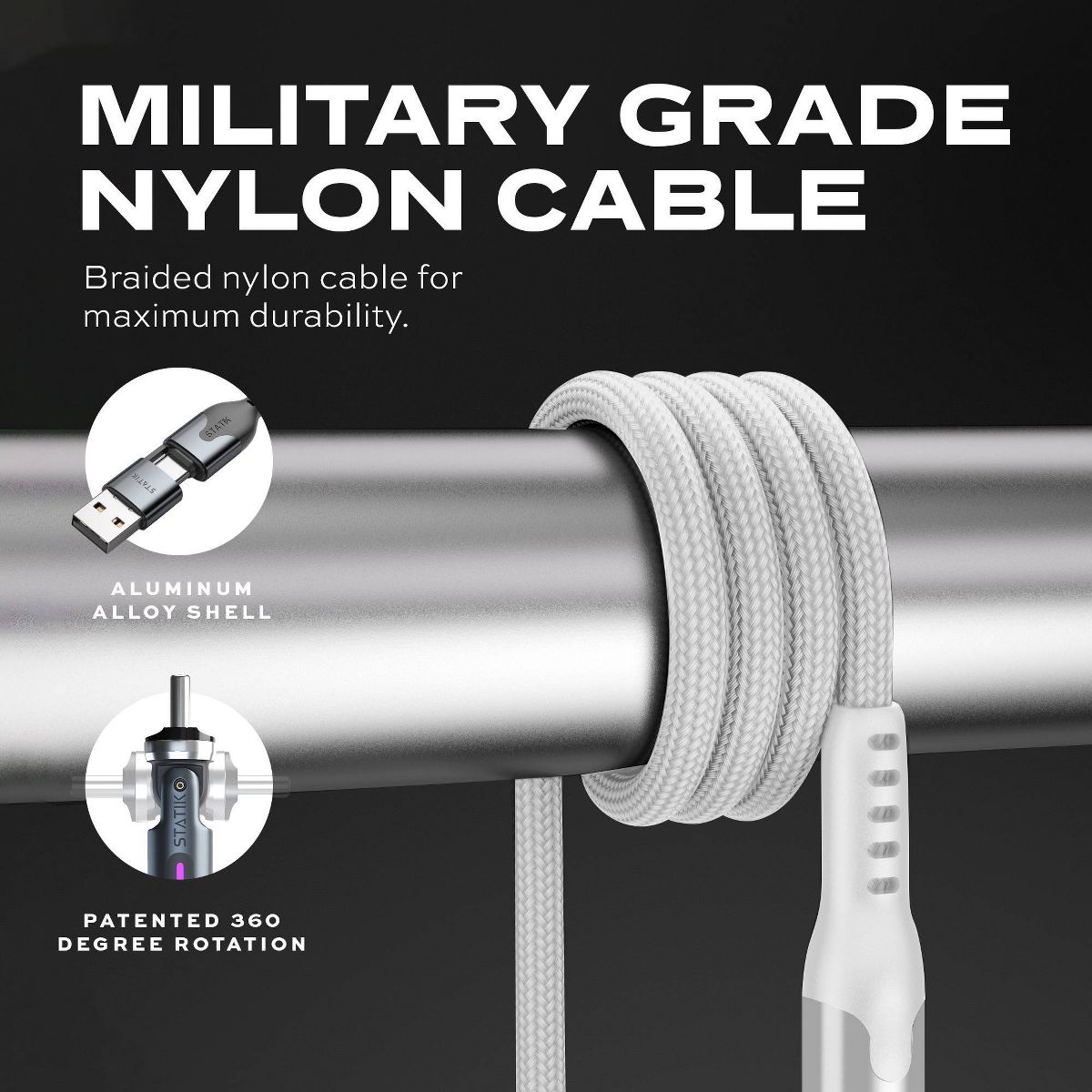 STATIK 3.3' PowerPivot Pro 360-Degree Nylon Braided USB-C to USB-C Charging Cable - Black: 480 Mbps Male-To-Male Data Cable