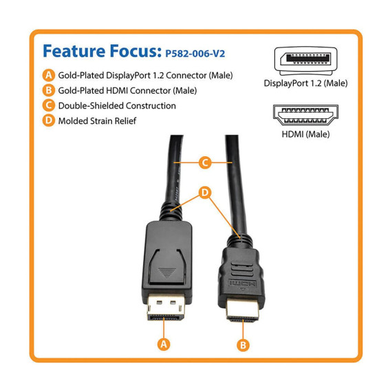 Send high-quality DisplayPort™ v1.2 audio and video signals to an HDMI® display with the Tripp Lite® by Eaton® DisplayPort™ 1.2 to HDMI® Adapter Cable. No separate adapter is needed and it provides vibrant videos because it supports 4K UHD at 30 Hz. The cable also has a latching DisplayPort™ plug for a secure connection. Please note the connected computer must have a DP++ (DisplayPort™ ++) dual-mode port.