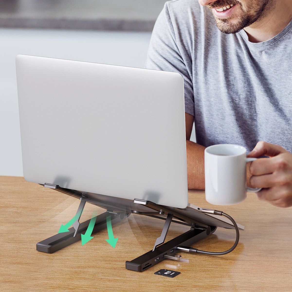 UGREEN Portable & Foldable Laptop Adapter/Stand with Multi-angel Adjustments features a 5-in-1 USB-C 5 Gbps High-Speed Transmission that can support HD Display for Windows/MacOS/Linux. It also features 2 USB 3.0 A ports, a HDMI port, and a SD/TF card reader to expand your capabilities.