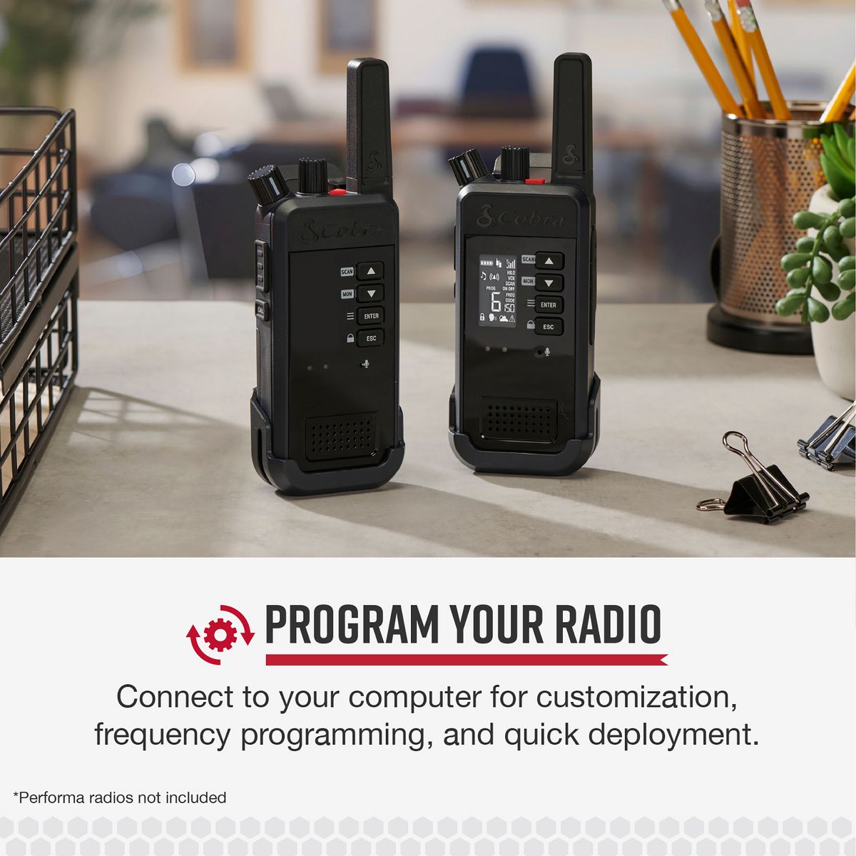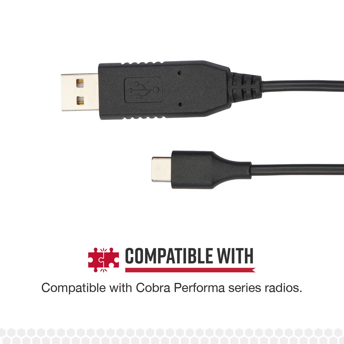 Is your company using Cobra® Performa 2-way handheld business radios? Or are your family and friends using the Cobra® TrailBlazer GMRS walkie-talkies? Use this special USB-C® to USB-A radio programming cable to connect your radio directly to a computer. The cable enables Cobra® radio programming computer software to easily program Performa or TrailBlazer radios to desired frequencies. Now you can fully customize your radio settings and quickly load saved settings from your computer._