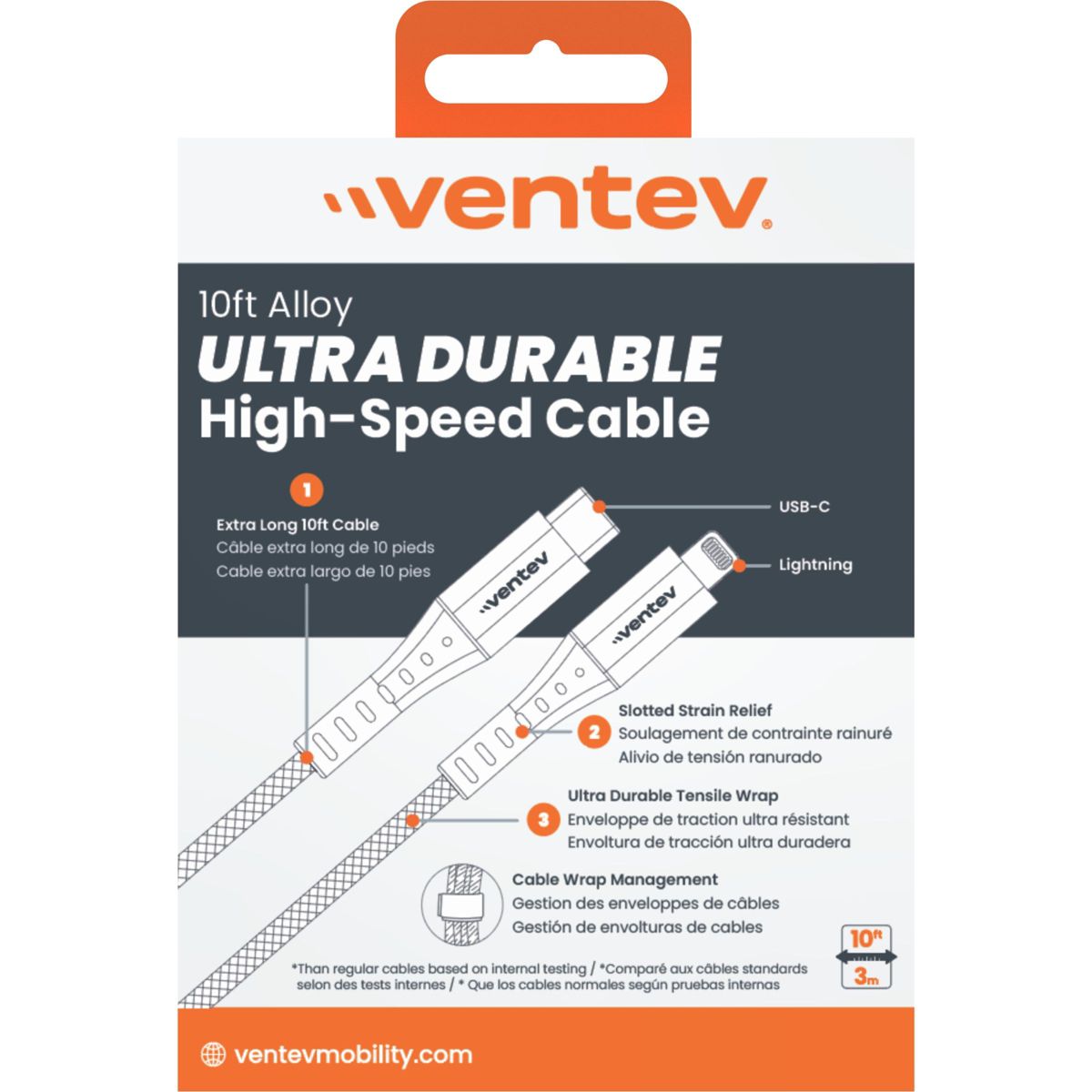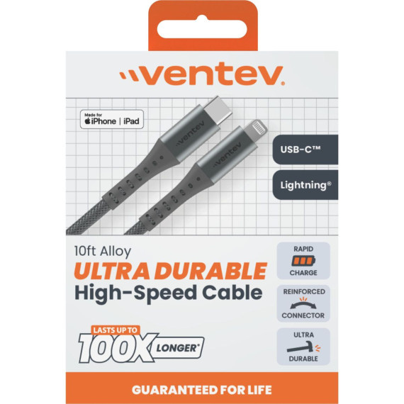 Ventev Alloy Usb-C To Apple Lightning High Speed Ultra Durable 10 Foot Cable Gray