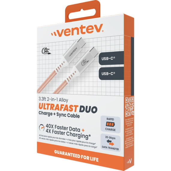 Ventev Ultrafast Duo Usb-C To Usb-C 2-In-1 High Speed & Data Transfer Ultra Durable 3 Foot Cable White