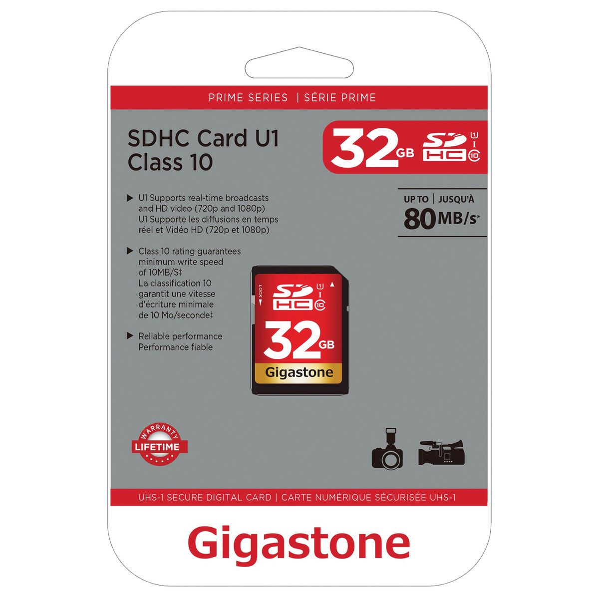 Capture life's exciting moments with the Prime Series SDHC Card from Gigastone. The high-performance 32 GB memory card has high data transfer speed up to 90 MB per second and is designed to help you get the best results when shooting Full HD video and high-resolution photos. It's also compatible with major smartphones.