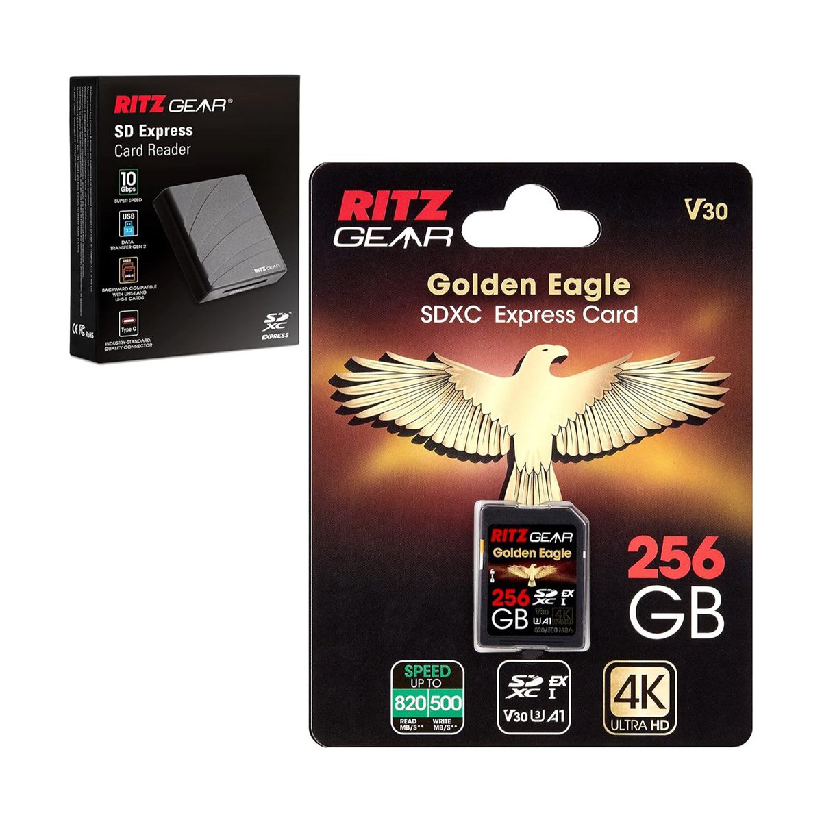 Ritz Gear SDExpress Golden Eagle SDXC SD Card, Express SD Card 256GB with SDExpress-Reader Included