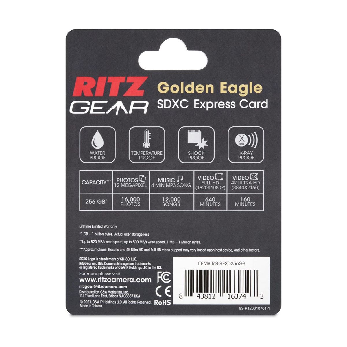 With its rugged build, this SDXC card is engineered to withstand the demands of any environment. Shockproof, waterproof, temperature-resistant, and x-ray safe, it keeps your data protected no matter where you work or travel. Offering 256GB of storage, it holds thousands of photos, hours of HD and 4K video, or extensive music libraries—all in one reliable card. Whether you’re a filmmaker, photographer, or content creator, the Ritz Gear Golden Eagle Express Card combines maximum speed, durability, and capacity to help you capture every memory with peace of mind.