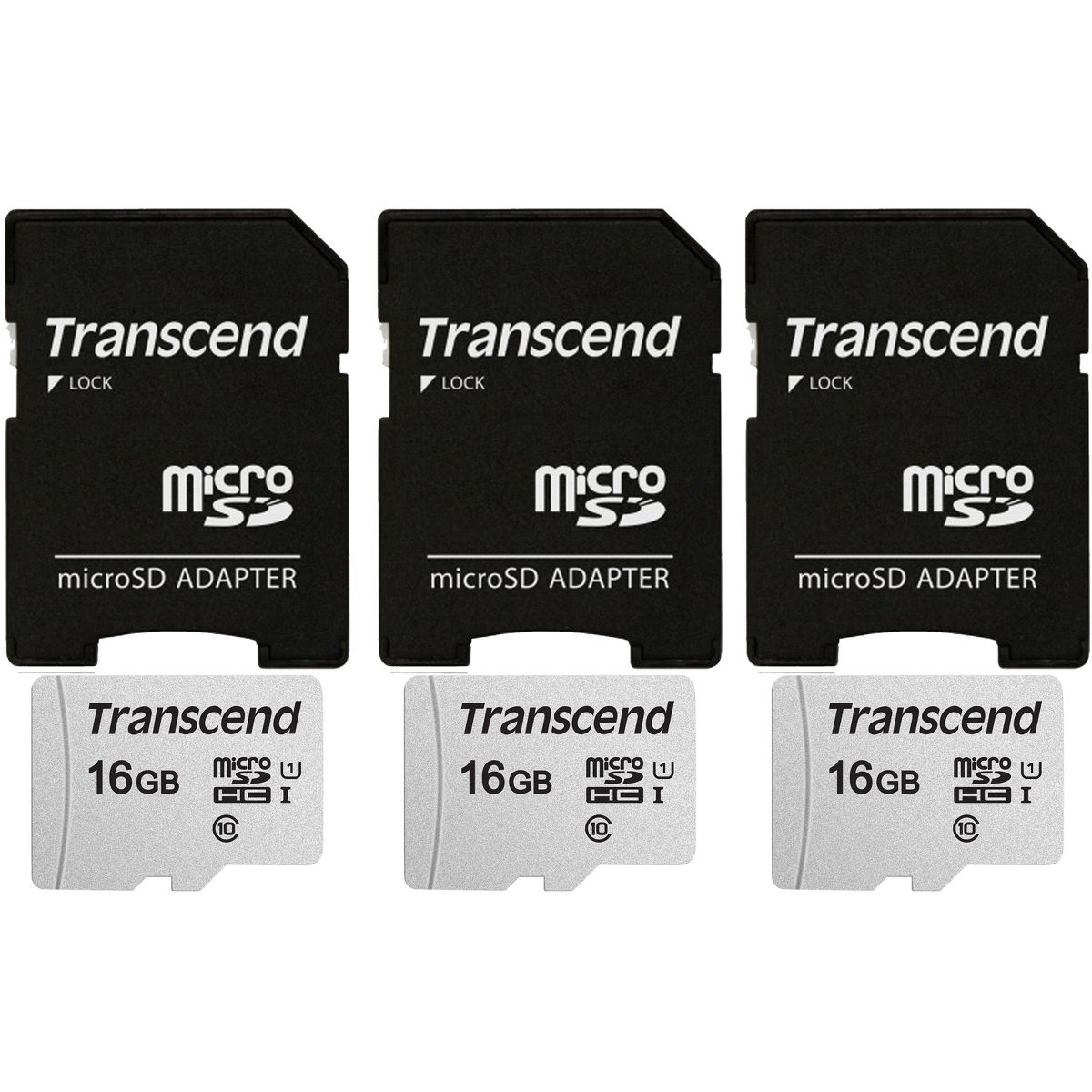 Three Transcend 16GB MicroSD 300s 95MB/s Class 10 Micro SDHC Memory Card with SD Adapter
