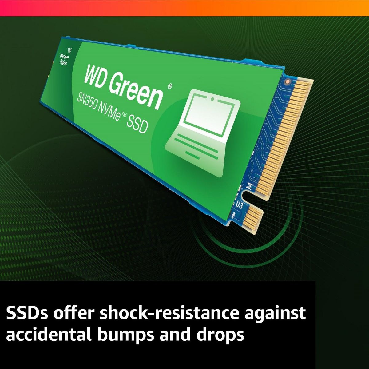 The WD Green SN350 NVMe SSD can revitalize your old computer for daily use. Whether you?re in class, shopping, chatting or surfing, this drive can work up to four times faster than SATA drives. Because they have no moving parts, solid state hard drives offer a shock-resistant design to help protect your important data against accidental bumps and drops. The slim M.2 2280 form factor allows for a quick and easy upgrade for any computer with an NVMe slot. Plus, with the downloadable Western Digital SSD Dashboard you can also monitor the health of your drive for added peace of mind.