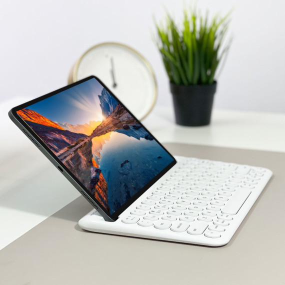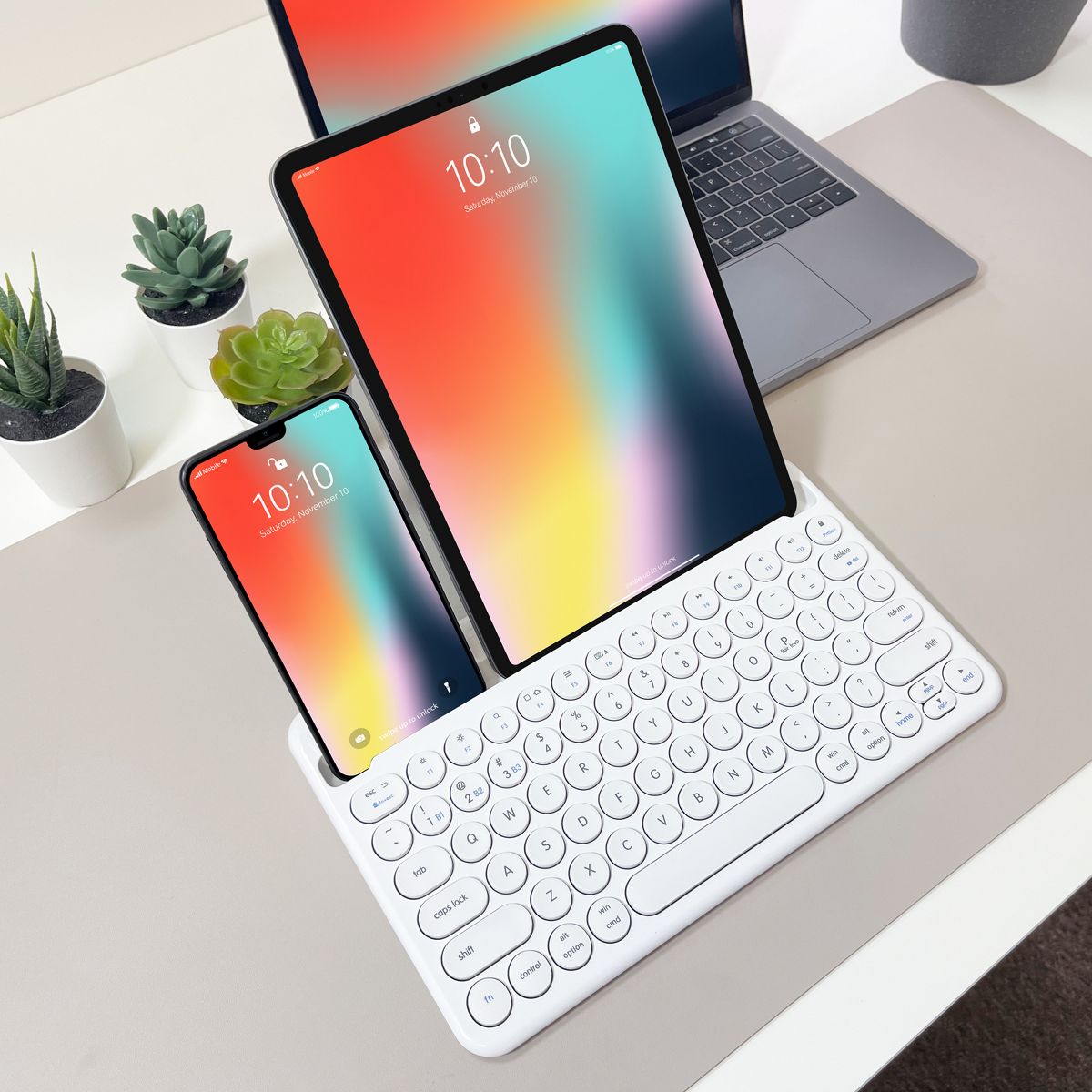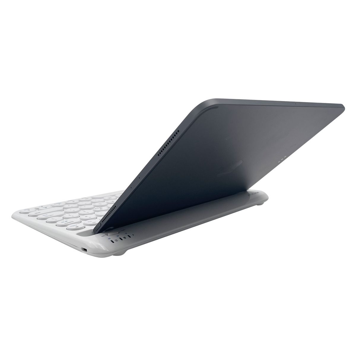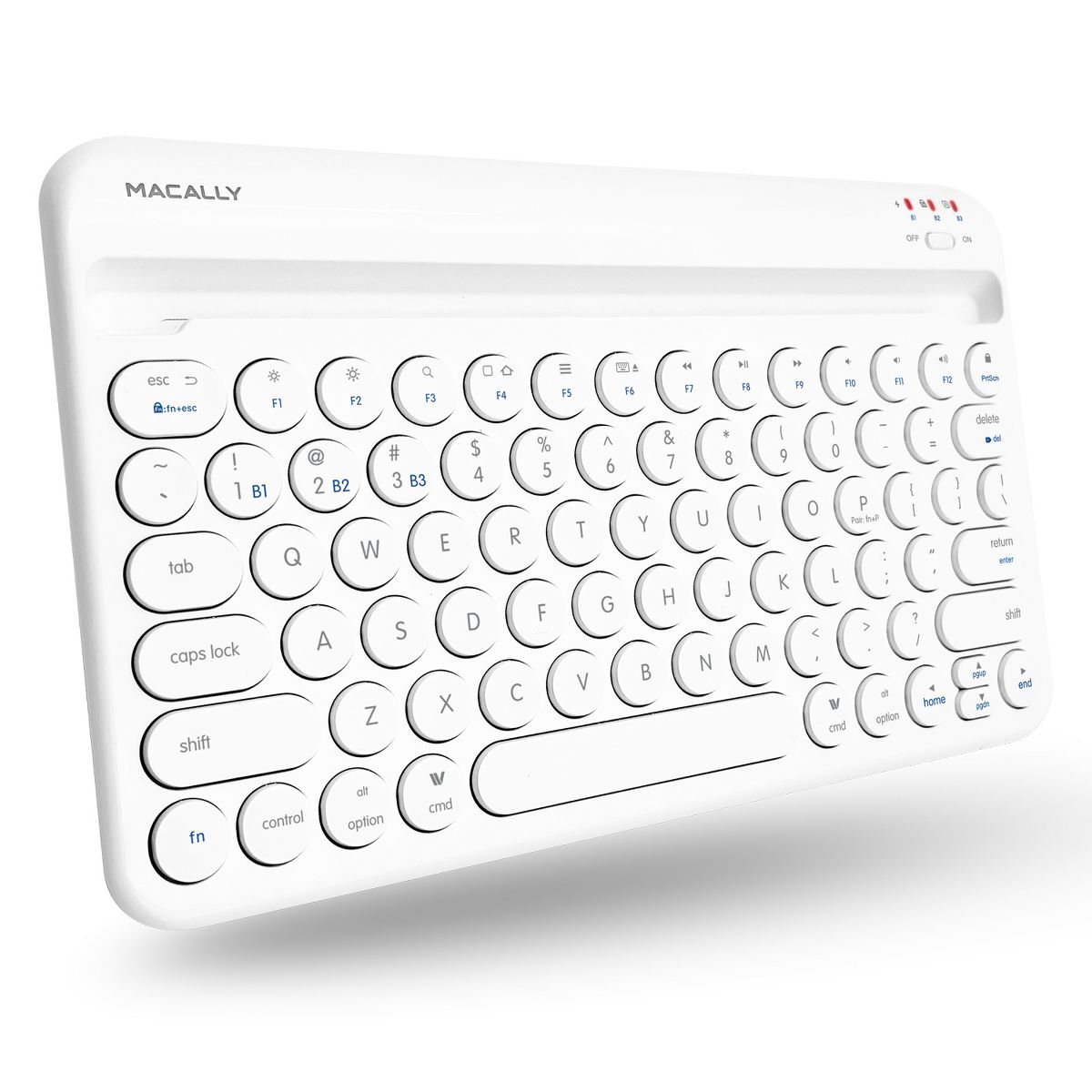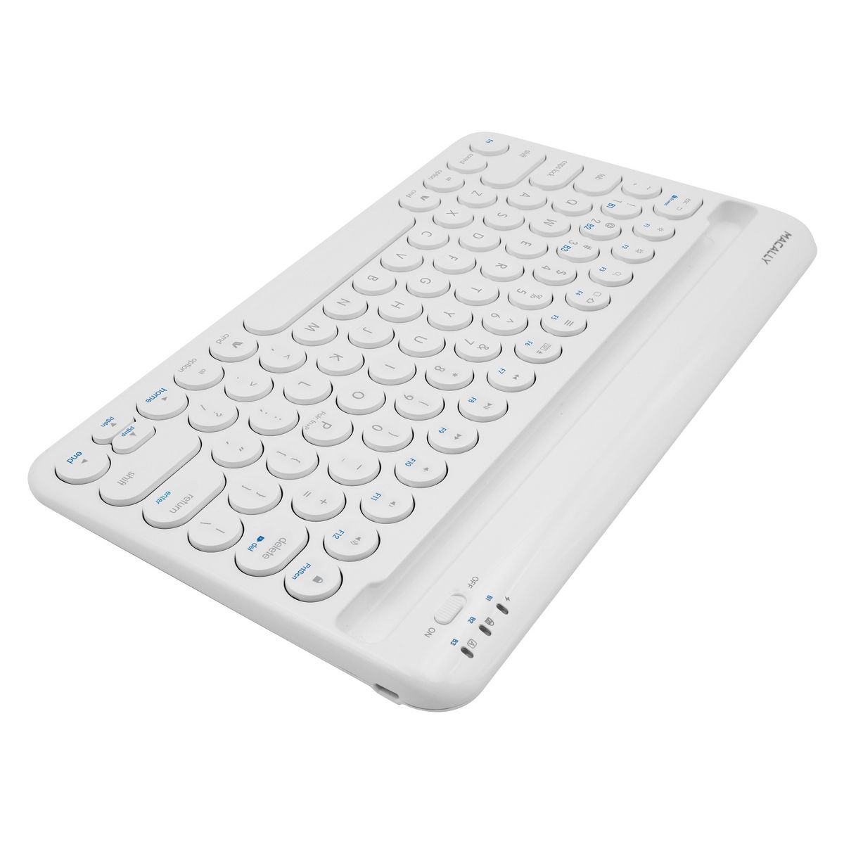 Macally white 78 Key Small Bluetooth Wireless Keyboard with Slot for Phone or Tablet, which easily dock your smartphone or tablet directly on the portable Bluetooth keyboard for iPhone through the built in 10.5" slot. Enjoy seamless multi-device use and pair between 3 devices simultaneously with our small wireless keyboard for tablet or smartphone, computer, which small enough to tuck away in your bag and with A 280mAh rechargeable battery, this Bluetooth keyboard is a great travel keyboard for on-the-go situations. With 78-keys, 13 shortcut keys, and LED indicators, the iPad Bluetooth keyboard allows you to easily complete any task at hand while saving space.