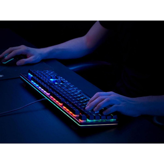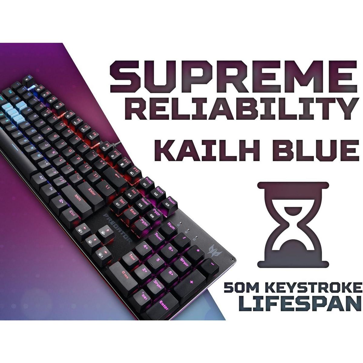 The Acer Predator Aethon 303 Wired Gaming Keyboard delivers precision, durability, and dynamic lighting for competitive gamers. Featuring tactile and responsive Kailh Blue mechanical switches, this keyboard ensures crisp actuation for fast-paced gameplay and accurate keystrokes. It boasts 100% anti-ghosting and N-key rollover to register every input, even during intense multi-key commands. With vibrant RGB illumination, 12 backlight effects, 5 pre-set gaming modes, and 3 sidelight effects, you can personalize your setup to match your style or mood. The durable construction and full-size layout offer long-lasting comfort and performance for extended sessions. Designed with gamers in mind, the Aethon 303 blends responsive mechanics with customizable lighting in a sleek black finish, making it an ideal centerpiece for any gaming rig. Whether you're battling in FPS or leading strategy games, this keyboard is built to keep you in control.