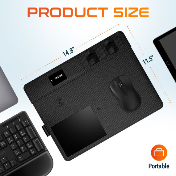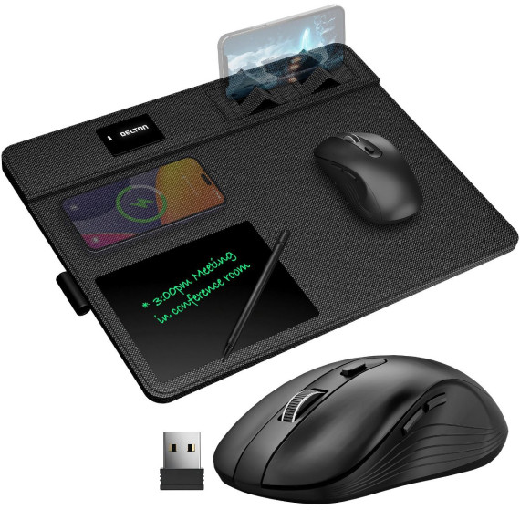 Upgrade your workspace with our comprehensive bundle featuring a Delton S8 wireless mouse, and D101 desk mouse pad. This mouse pad comes with a digital writing pad with a stylus pen, ideal for quick notes with its easy-clear key and sensitive touch. It also has a foldable phone stand and pen holder for added convenience and organization. Enjoy clutter-free charging for your devices, a smooth writing experience, and precise mouse control. Featuring a USB-C input port and 15W output, ensuring fast and efficient charging with multi-level protection. Our computer mouse offers reliable performance up to 30 feet away. It includes an auto-pair USB dongle, five high-quality buttons, and low power consumption to ensure long-lasting battery life. This quiet mouse offers three DPI levels (800/1200/1600) to suit your preferences and ensure precise control. Experience ergonomic design and effortless scrolling for enhanced productivity, complemented by seamless integration with all your devices.