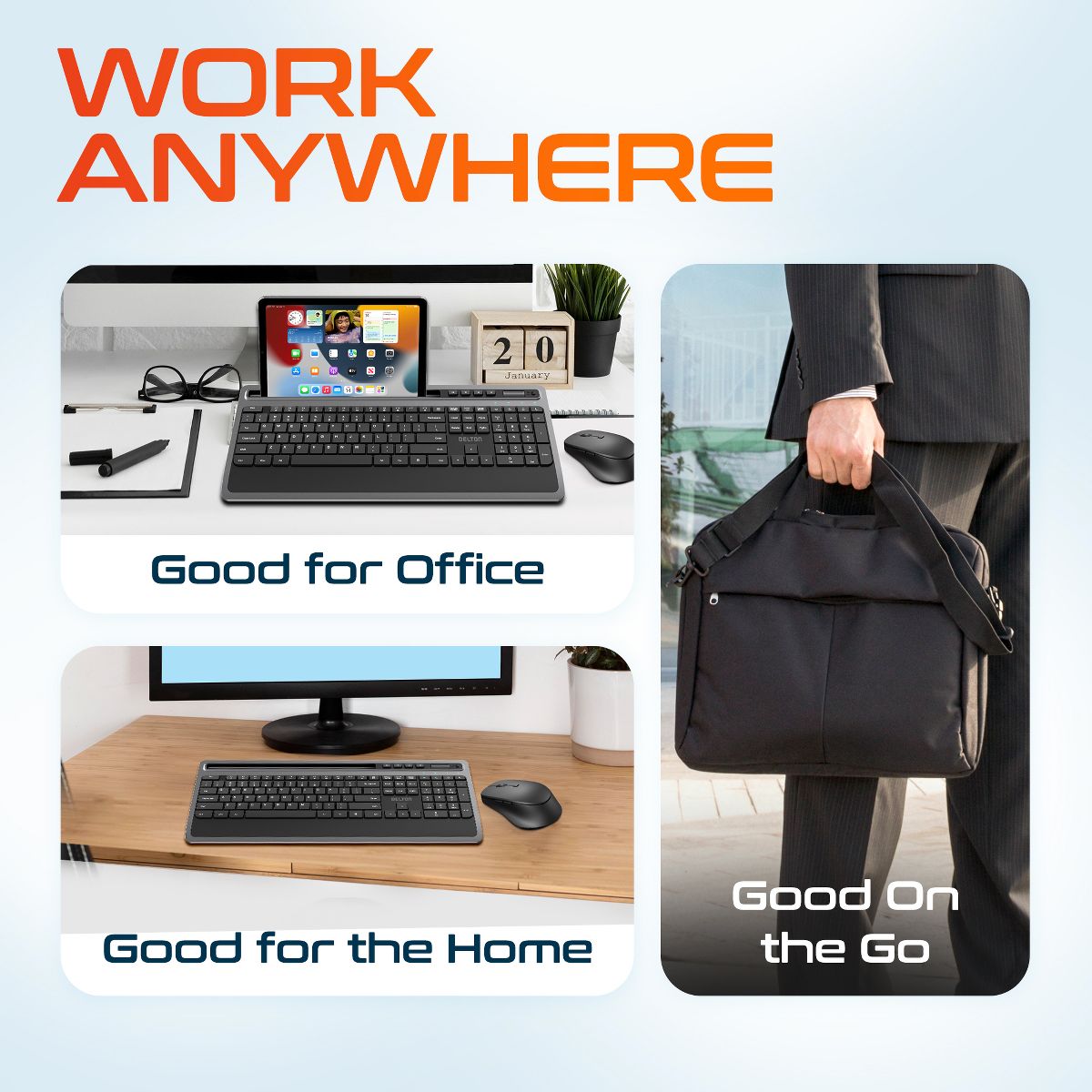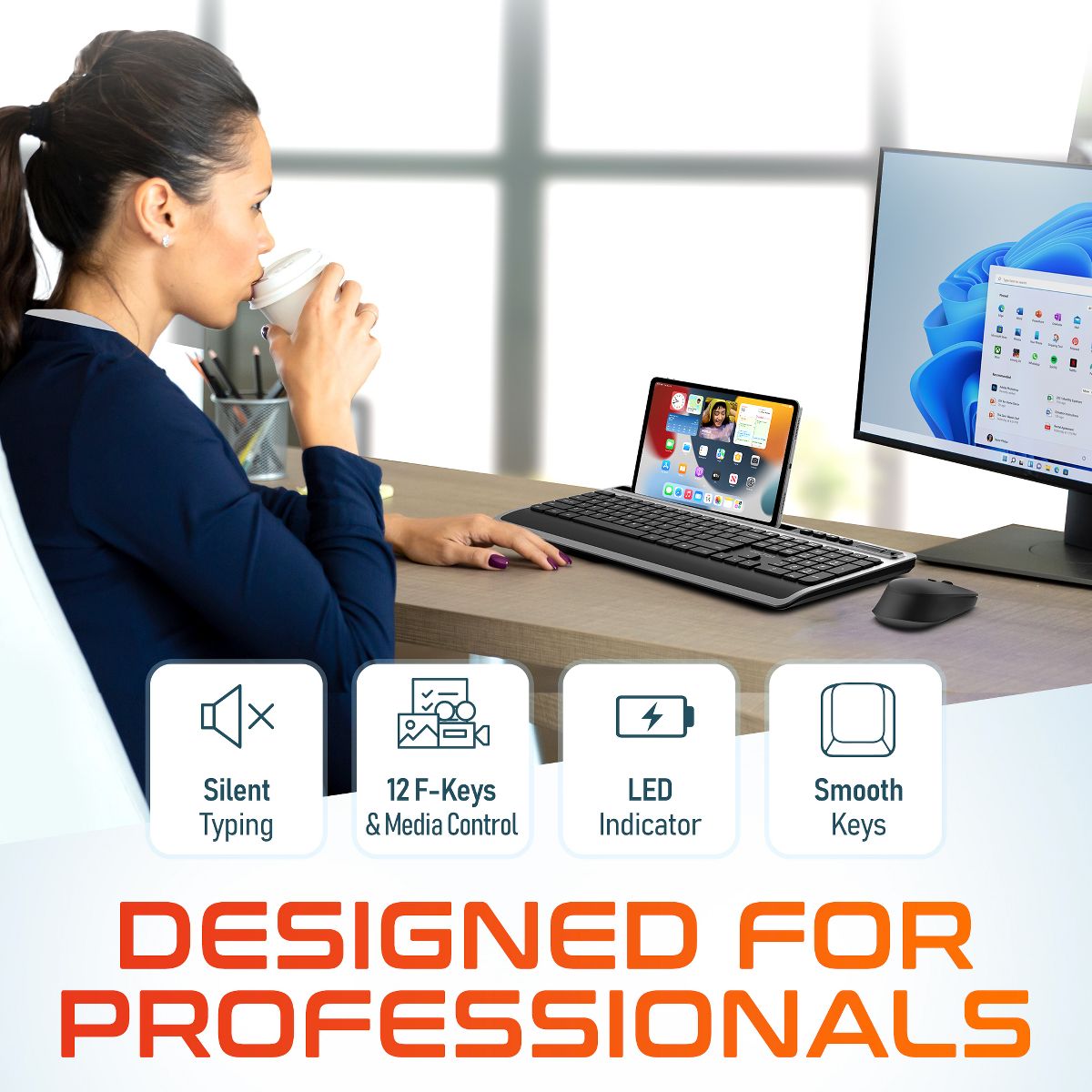 Enhance your productivity with the Delton T42 keyboard and M42 mouse combo, expertly designed for comfort and functionality. The full-sized 114-key wireless keyboard features a slim profile, numeric keypad, and 12 multimedia keys for easy access to shortcuts, while the tablet slot at the top offers convenient multi-device use. Paired with a wireless ergonomic mouse that includes six buttons for efficient navigation, customizable DPI settings (800, 1200, 1600), and precise optical tracking, this wireless keyboard mouse combo is ideal for extended work sessions. Enjoy seamless 2.4 GHz wireless connectivity with a 30ft range for both devices using a single USB dongle, ensuring clutter-free convenience.
