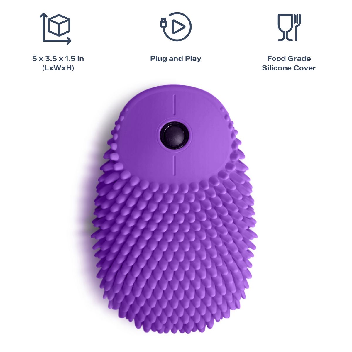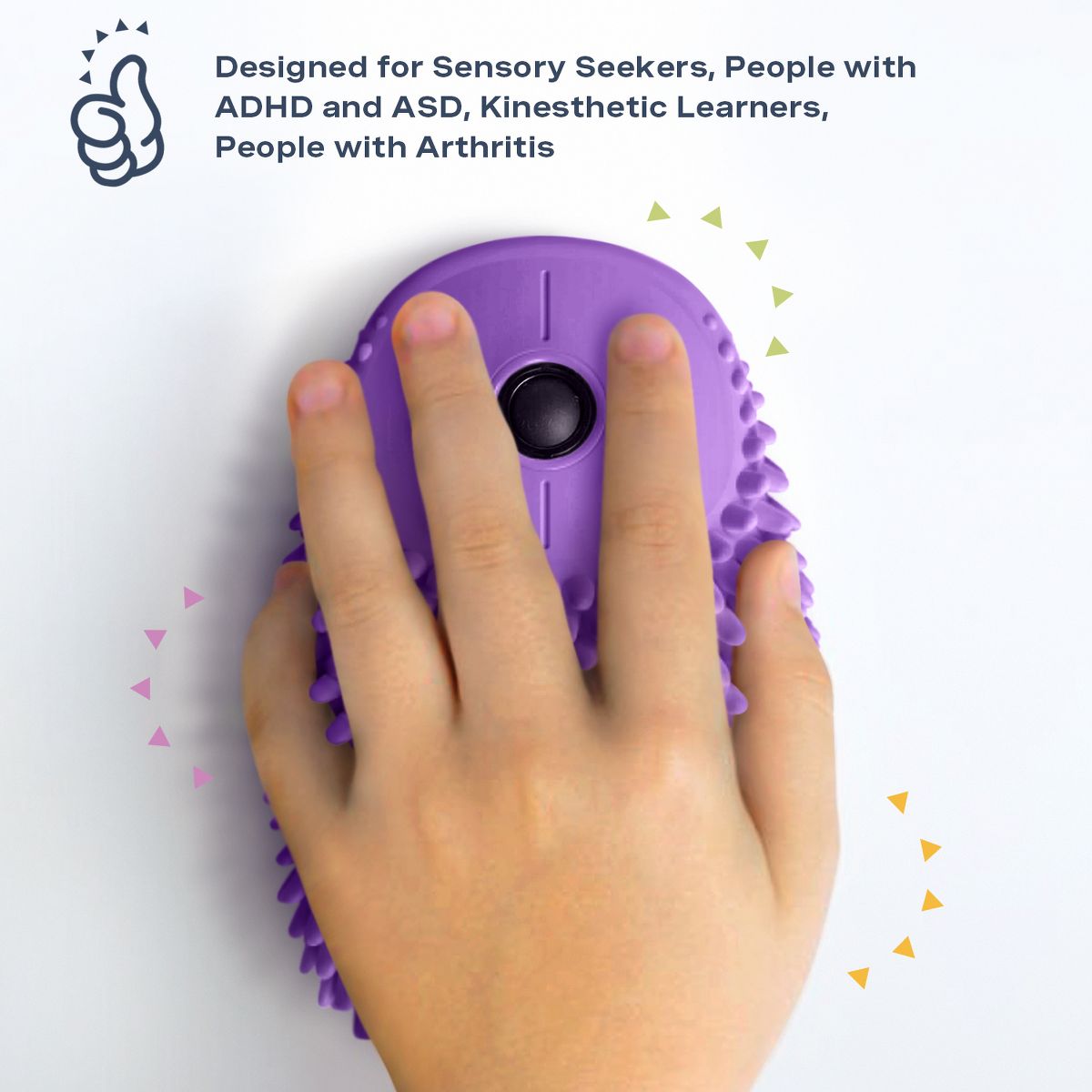 Hedgehog Hoglet Fidget Computer Mouse, Grape | The Hoglet is a fidget gadget and computer mouse that is beneficial for sensory seekers, helping them to focus while working in front of a computer. The first ever mouse to bring together fun and functionality in one cool wireless mouse! Made with high quality, food grade silicone that easily peels off for deep cleaning. Washable silicone cover may be easily washed with wet wipes, washcloths or even on top of the washing machine. No driver installation needed! Just plug the receiver into the computer or laptop and fidget away. Perfect for sensory seekers, people who need to fidget to focus, those with ADHD, ADD, ASD, and arthritis. With 2.4GHZ wireless technology that provides a powerful, reliable connection without cable drags & auto sleeps when inactive to save power! The soft, high quality silicone provides soft clicking sounds, that is perfect for those who are sensitive to sound. Click away without causing disruption inside the classroom, office, library, coffee shops, or even during meetings.