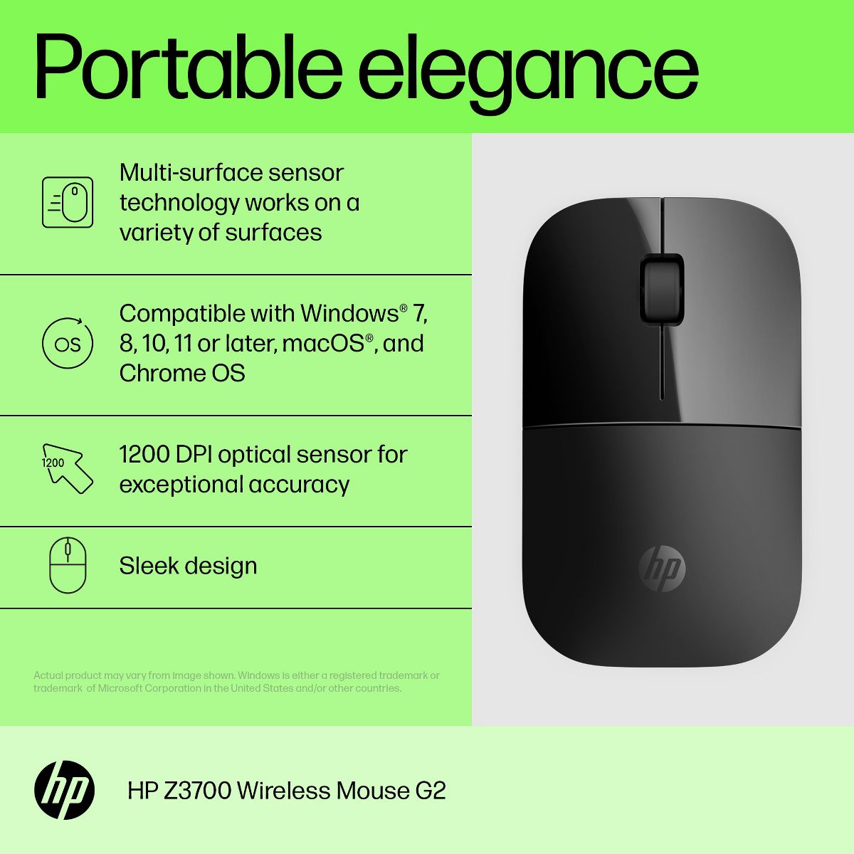 Overview - It’s time your accessories matched your needs. Meet your new wireless mouse, carefully crafted to bring its unique slim style to your work. It’s functional. It’s portable. It’s fashionable. It’s yours. What's in the box? - HP Wireless Mouse Z3700; Dongle; 1 AA battery; Quick Start Guide; Product notices; Warranty card Disclaimers - Wireless connectivity up to 30ft (10m). - Batterylife depends on usage.