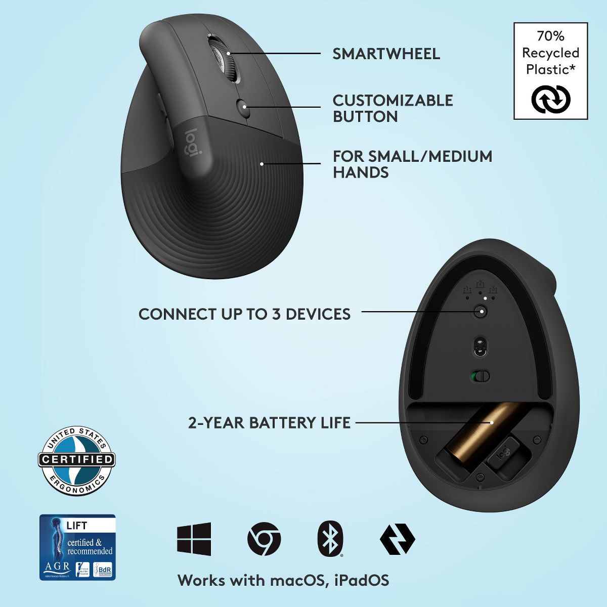 When the desk life gets you down, lift yourself up. A great fit for small to medium hands, Lift Vertical Ergonomic Mouse is crafted for comfort from first light to late night.Raise your hand into instant comfort with a soft rubber grip and cozy thumb rest. Realign into a more natural posture at 57°. And feel focus flow from morning to night with productivity features designed to suit your working style. Connect easily to up to 3 devices via Bluetooth or Logi Bolt, and enjoy up to 2 years’ battery life in a single AA battery.(4)