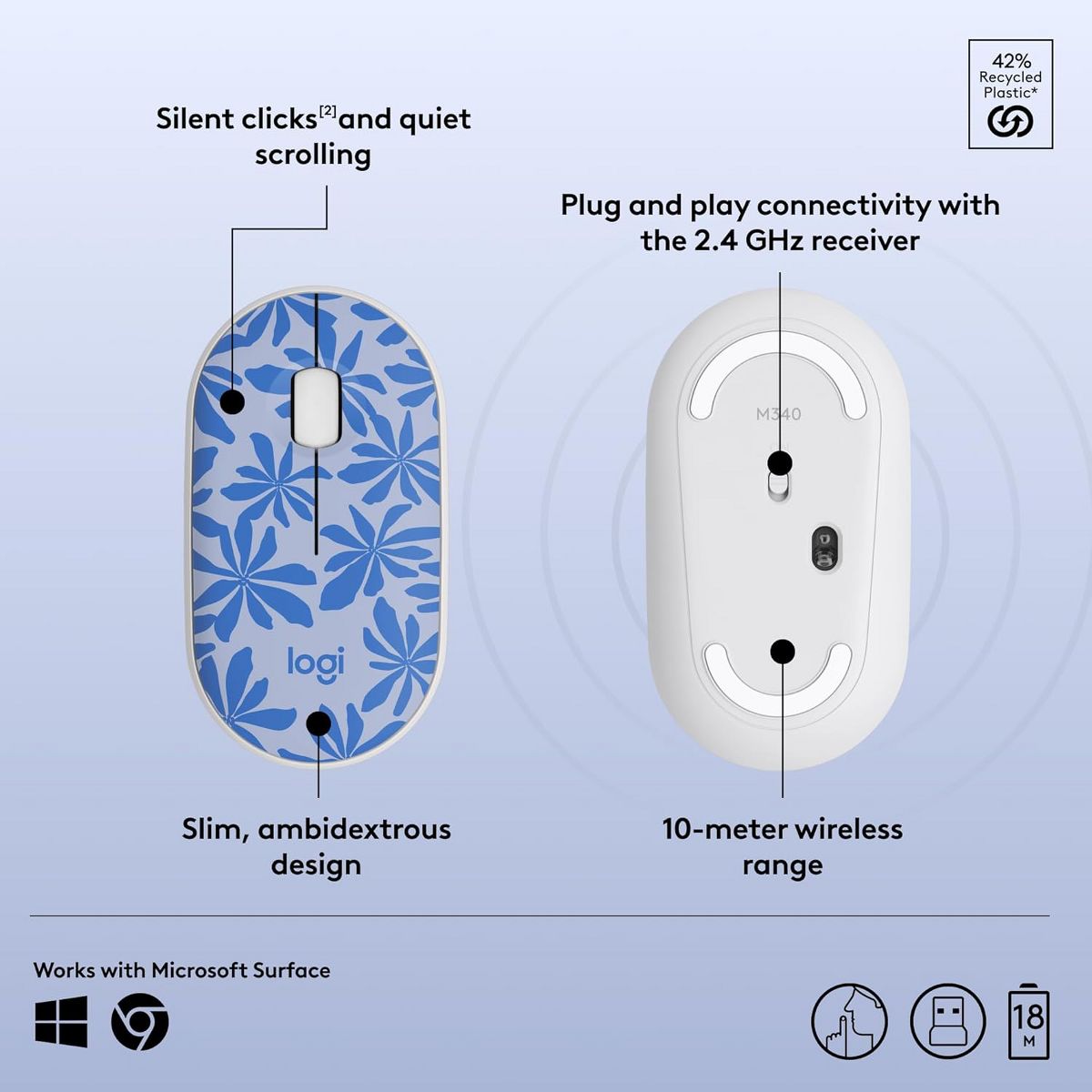 Equipped with a convenient USB receiver, the M340 provides a stable wireless connection with precision tracking, allowing you to navigate effortlessly across documents, websites, and applications. Long-lasting battery performance means fewer interruptions, keeping you focused on what matters most.