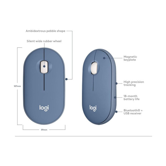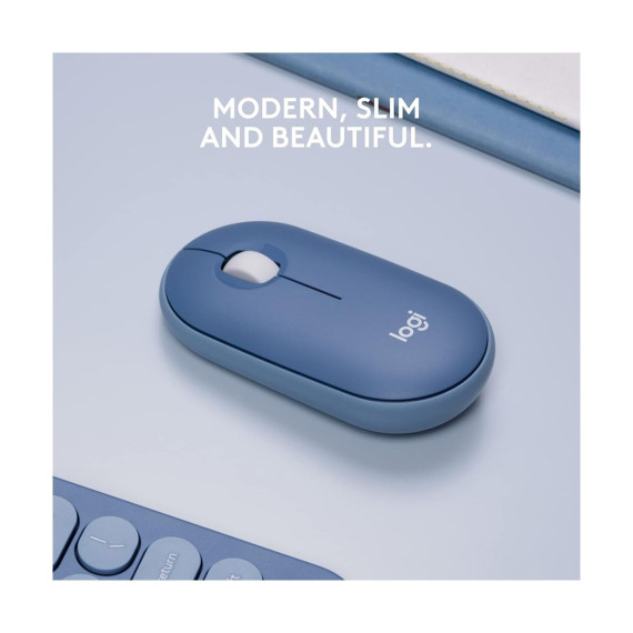 Logitech Pebble Mouse is a modern, slim, and silent mouse designed for your curated lifestyle. The pebble shape of this portable mouse feels great in your hand and is easy to scoop up and take with you. This optical mouse also offers optimal performance in a simple package with high-precision optical tracking and a wide rubber scroll wheel. 18-month battery life and dual connectivity (Bluetooth and 2.4GHz receiver) ensure a hassle-free user experience.