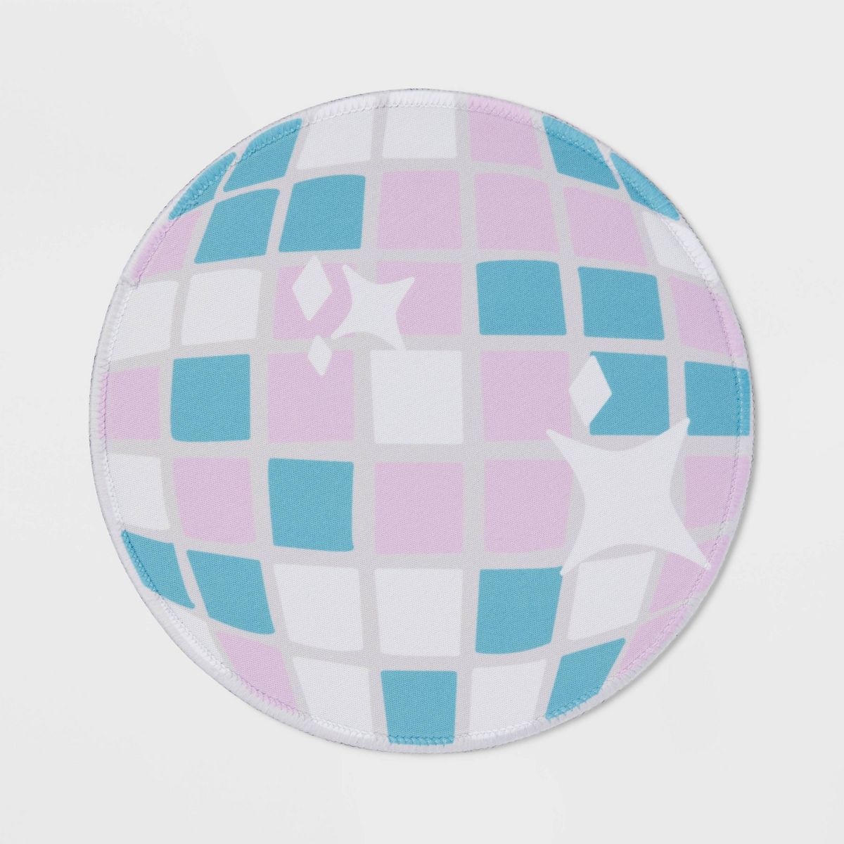 The Heyday™ Disco Ball Mouse Pad measures 8 inches long by 8 inches wide. It's the perfect size to place your mouse on. It allows enough room for you to move your mouse around freely, without taking up too much room on your workspace. The back side of the mouse pad has a rubber backing that helps the pad stay in place once you set it down. There is no slipping and sliding of the pad. The front is made of polyester and is nice and smooth. My mouse rolls over it with no hang-ups or issues. Both sides are stitched together well. The pad is lightweight, yet it's very durable. I like the colors of the disco ball design. It gives my desk a pop of color. I like that this mouse pad comes with a one-year warranty.